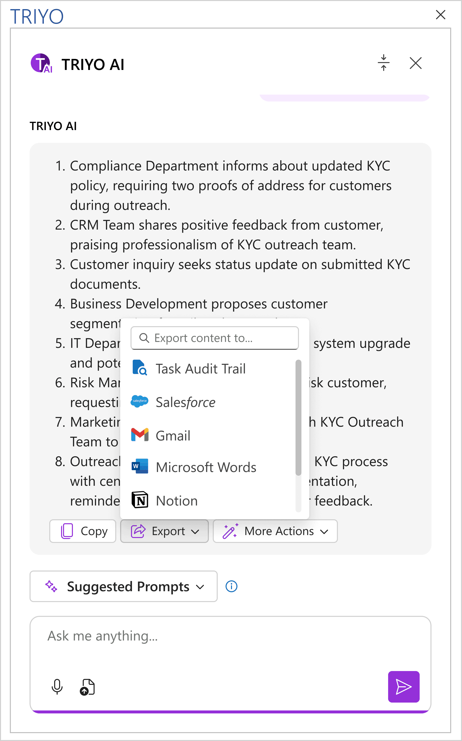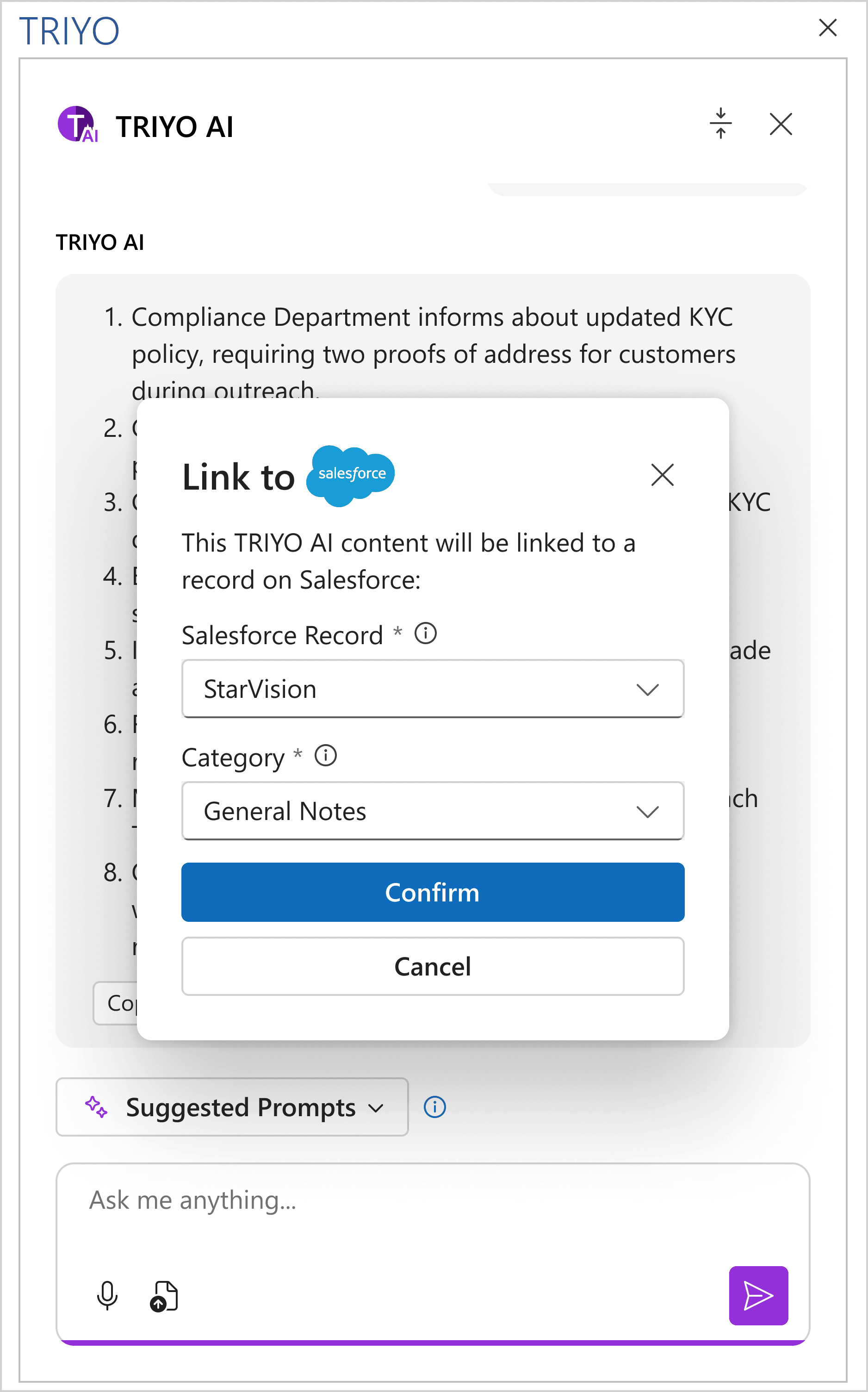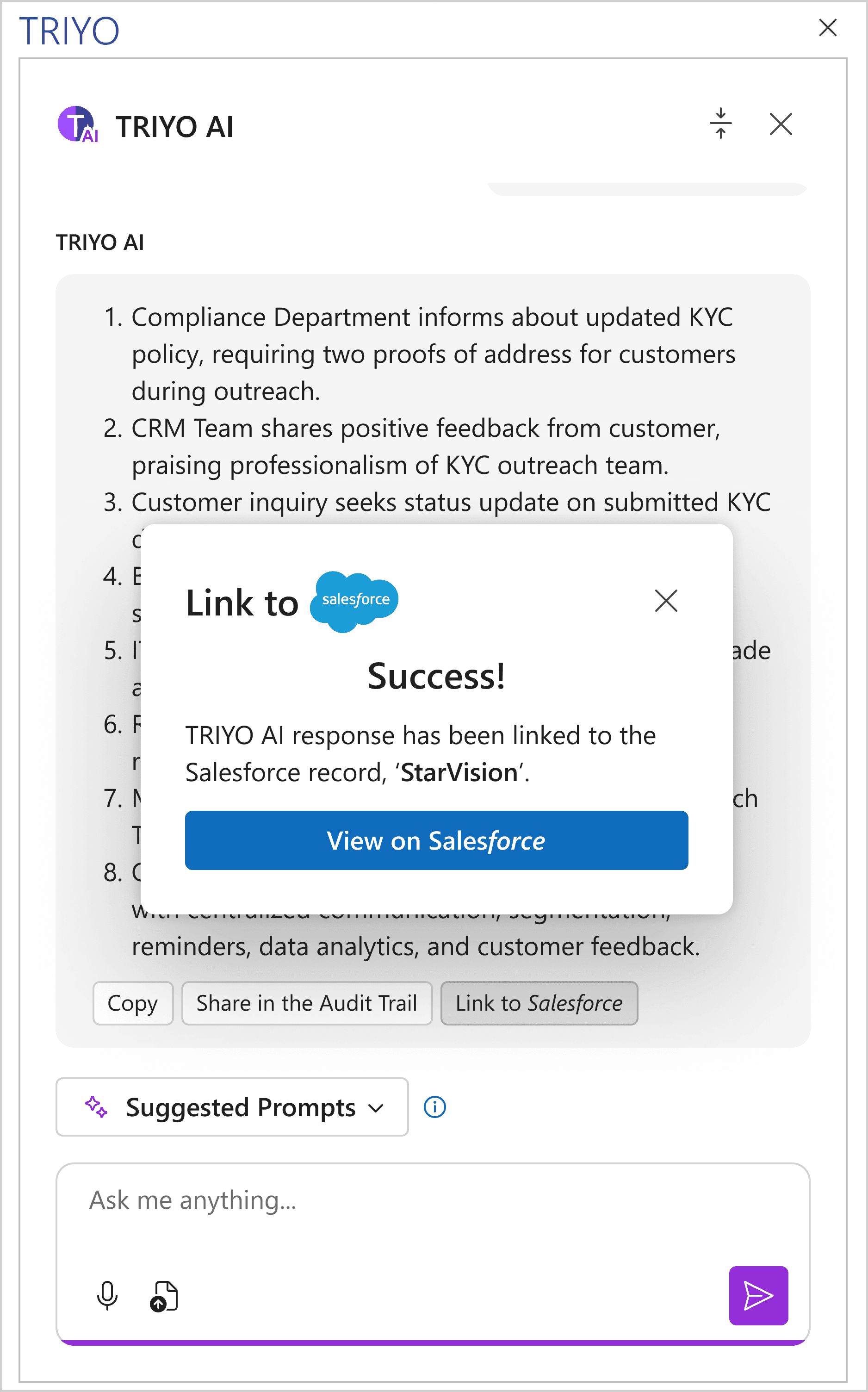 For instance, after the AI generates a summary, a suggested action like "Link to Salesforce" can allow users to log an AI generated content directly as part of a client’s record in Salesforce. This not only streamlines workflows but also ensures data consistency across platforms.