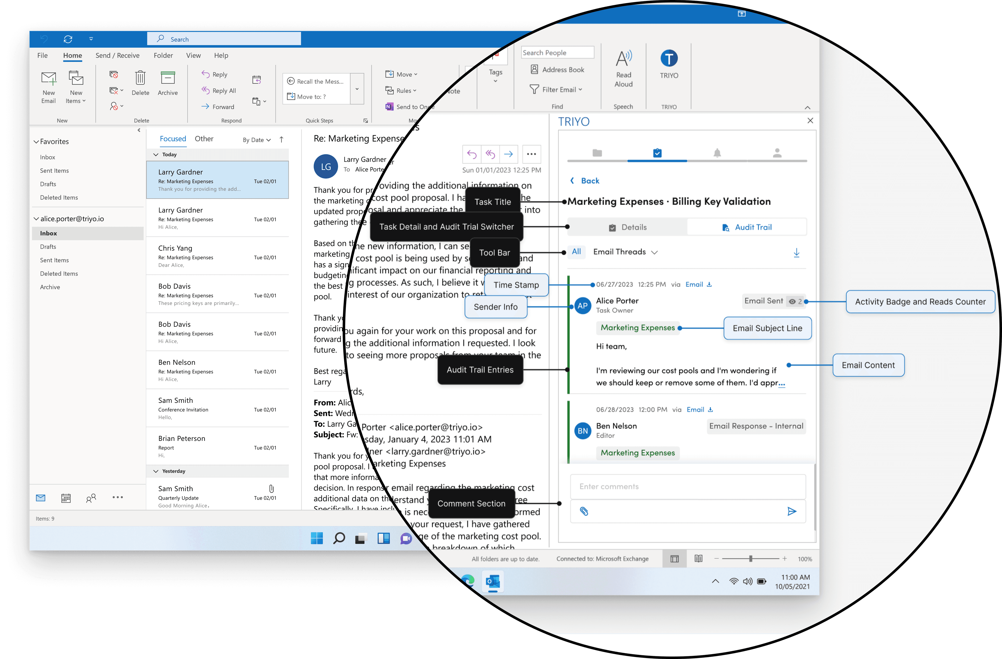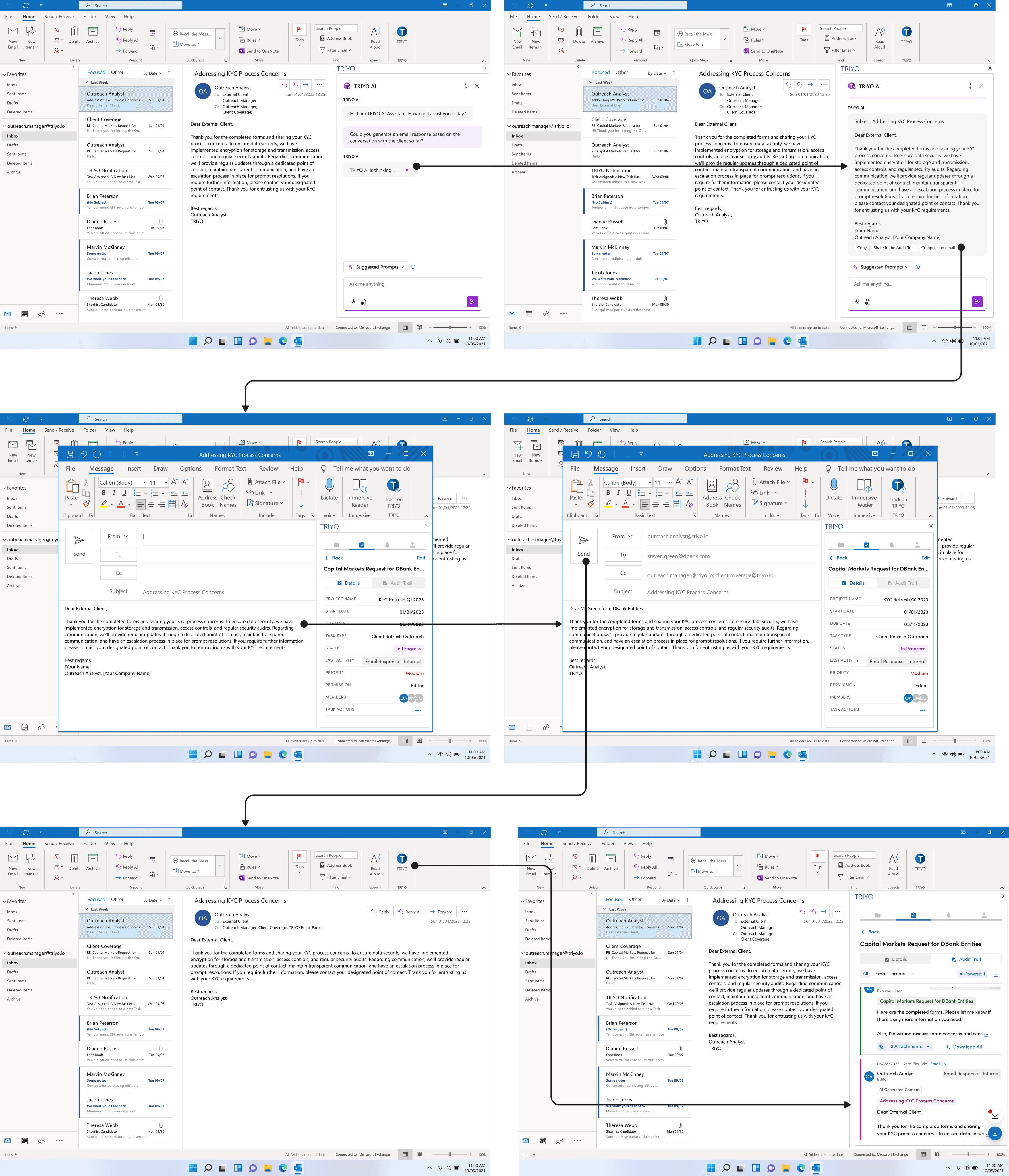 TRIYO enhances email platforms like Microsoft Outlook by equipping financial professionals with powerful email tracking and task management tools. With TRIYO, team members can view all email communications tied to a specific client or deal in one place, streamlining collaboration and reducing the risk of miscommunication (see more on the previous project, TRIYO Audit Trail, which focuses on redesign of email tracking functionalities).