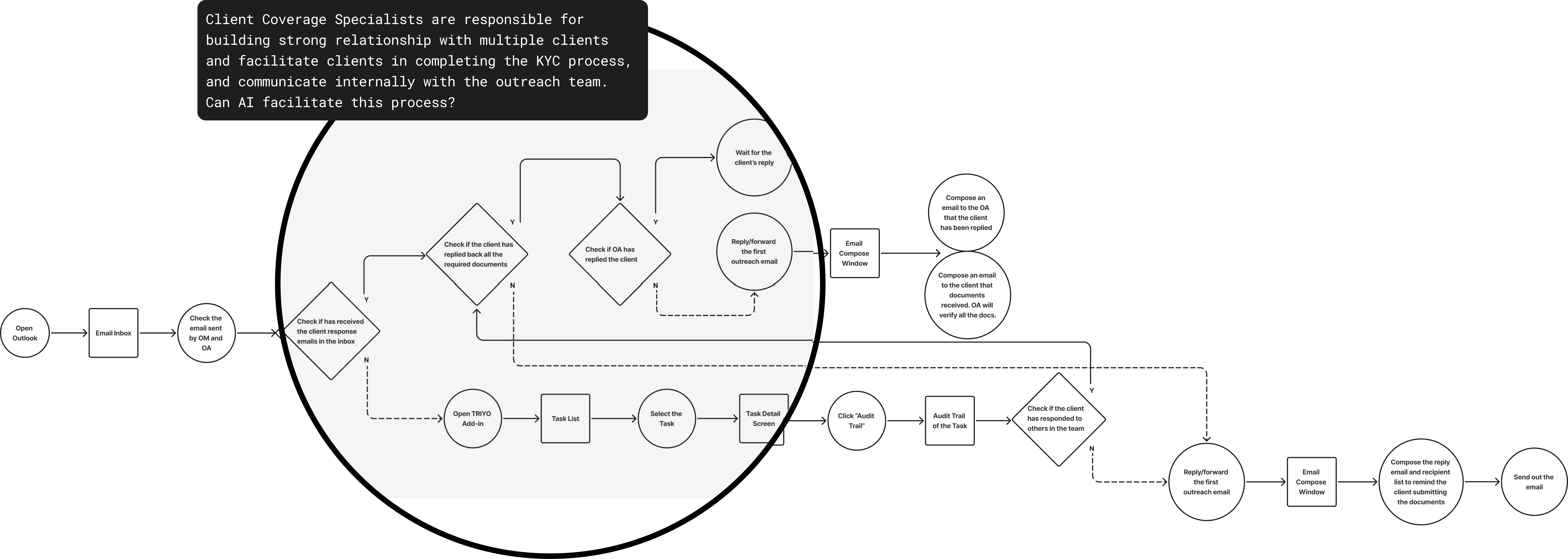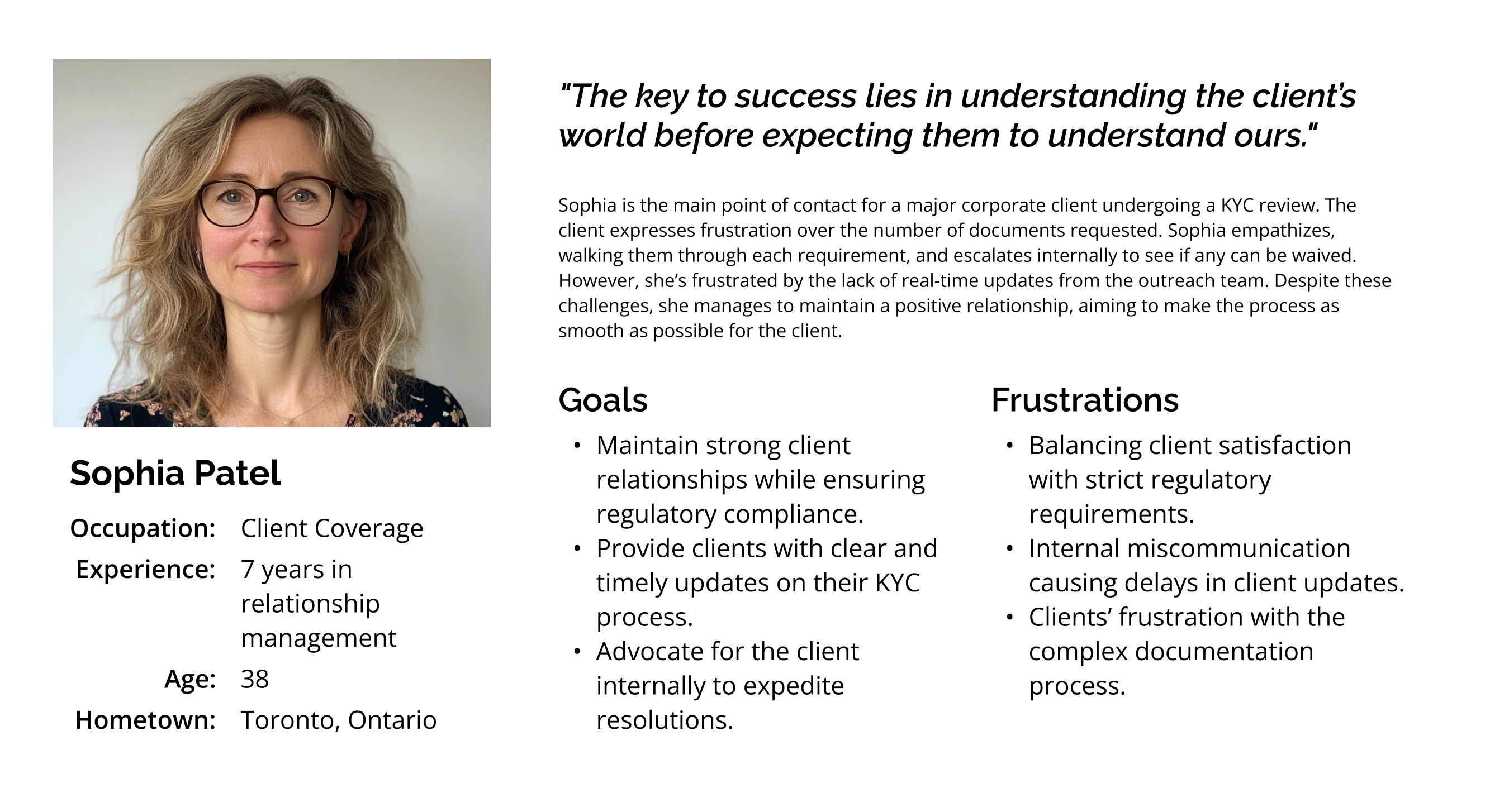 Sophia is an experienced Client Coverage Specialist who needs a way to provide clear and timely updates to her clients on their KYC process while balancing client satisfaction and regulatory compliance. This is because she struggles with internal miscommunication and lacks real-time updates from the outreach team, which leads to delays and increased client frustration.