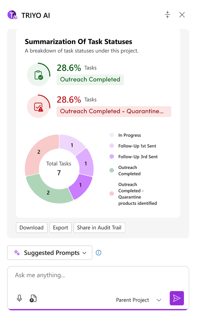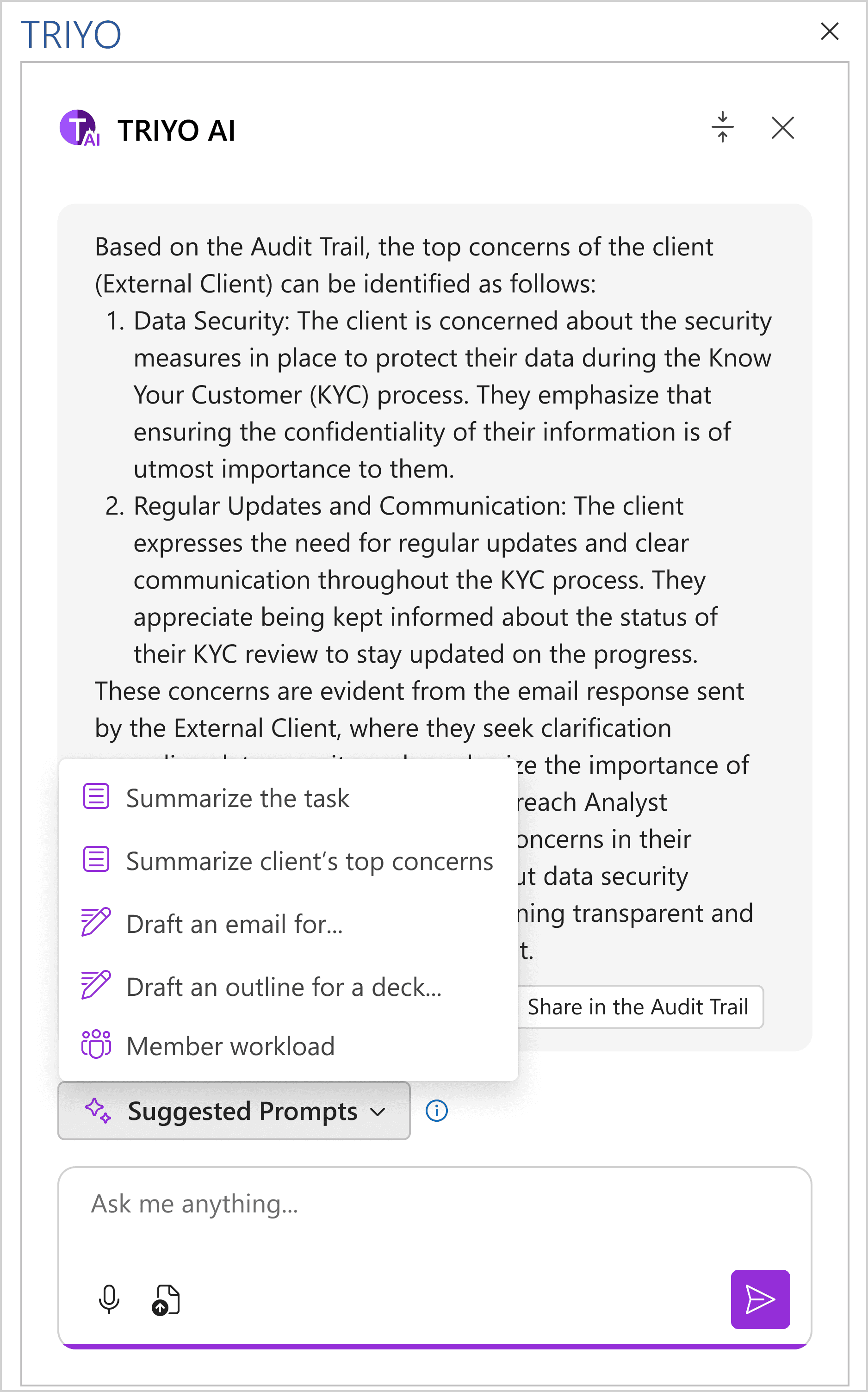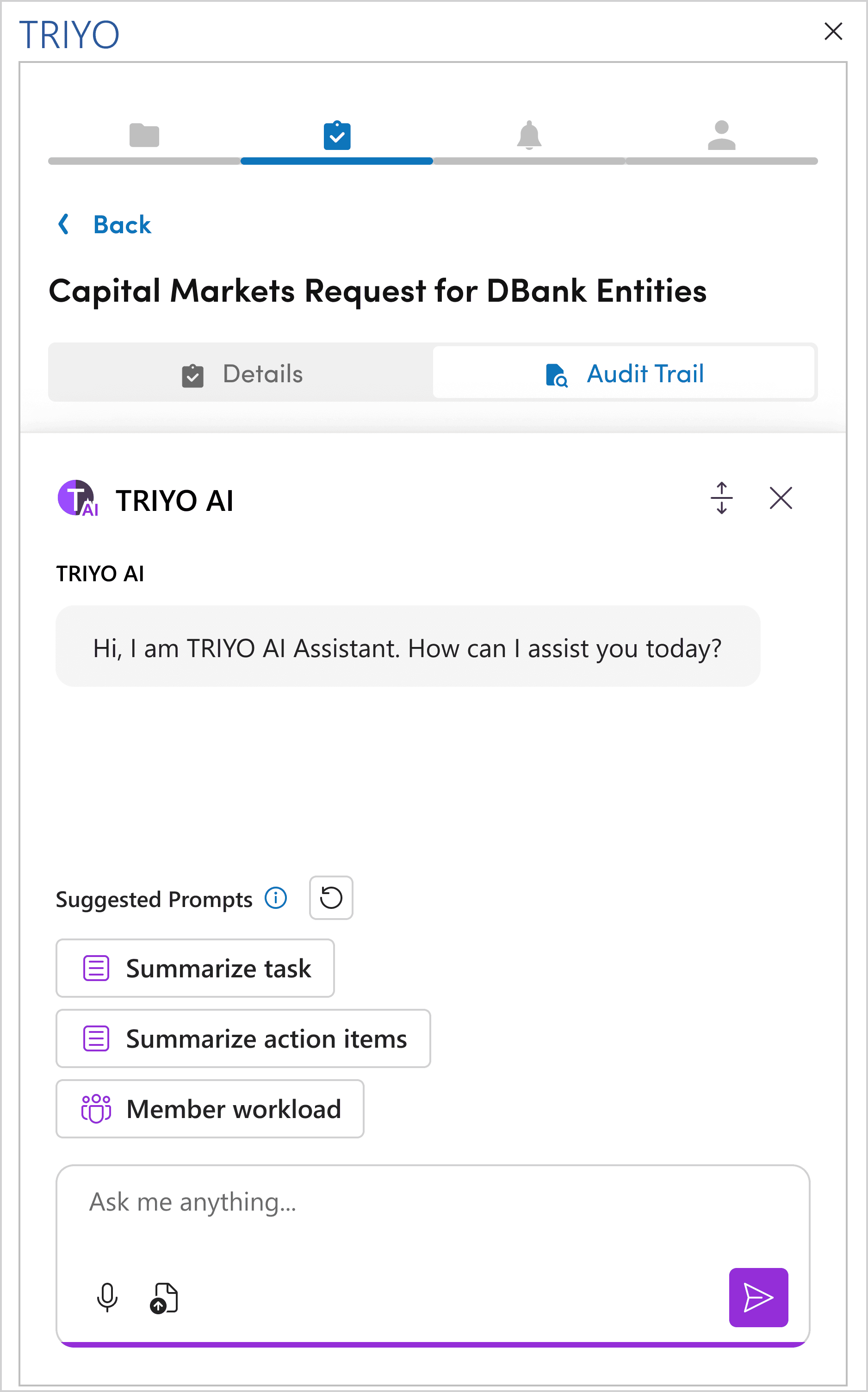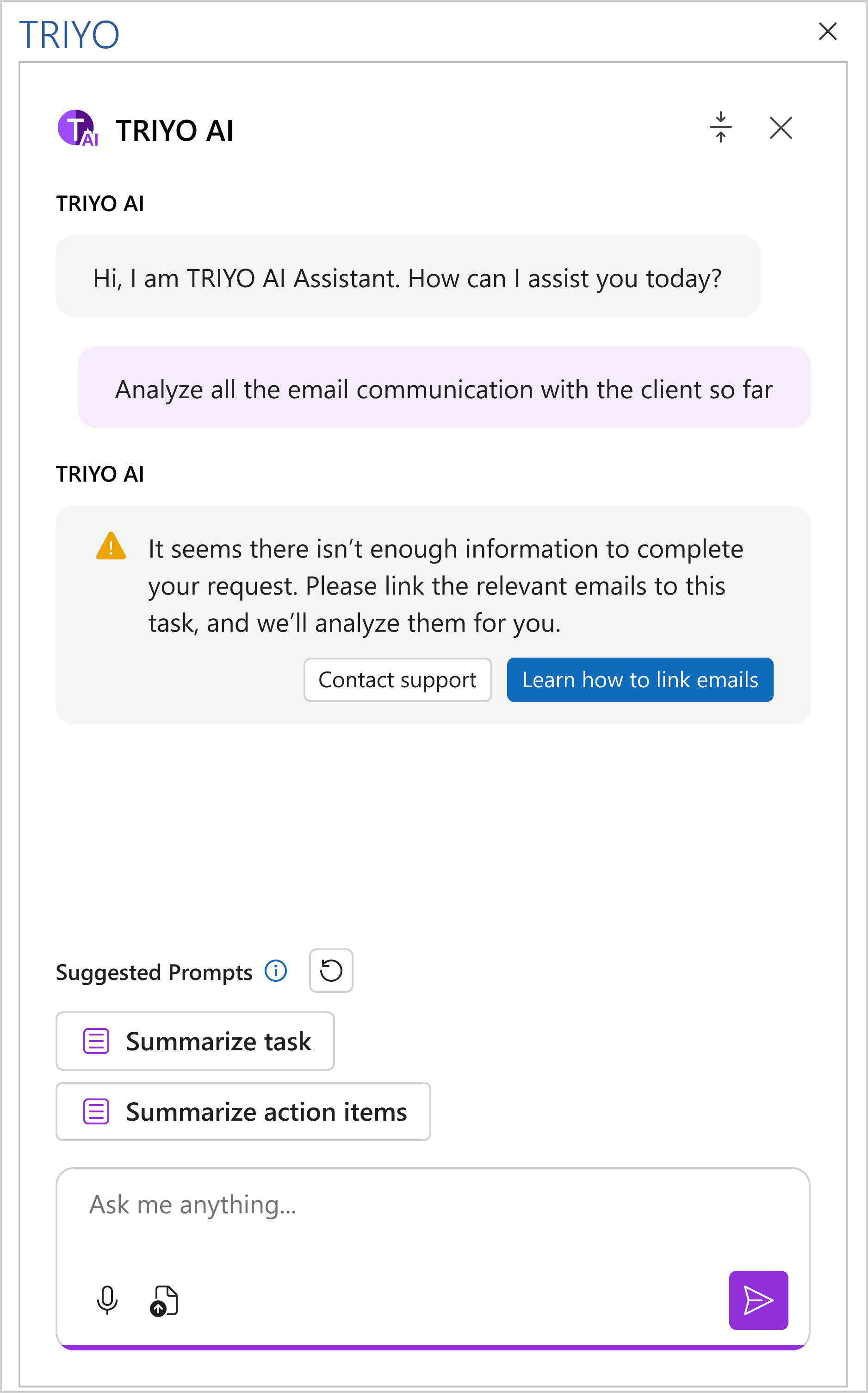 Within the TRIYO Add-in, the AI Chatbot is accessible via a floating button in the Task Audit Trail, where users can track all email and system updates related to a task. The AI chat window initially opens in a compact mode to provide users with more context (task heading) in a small screen, while a maximized view offers more space for in-depth conversations when needed.