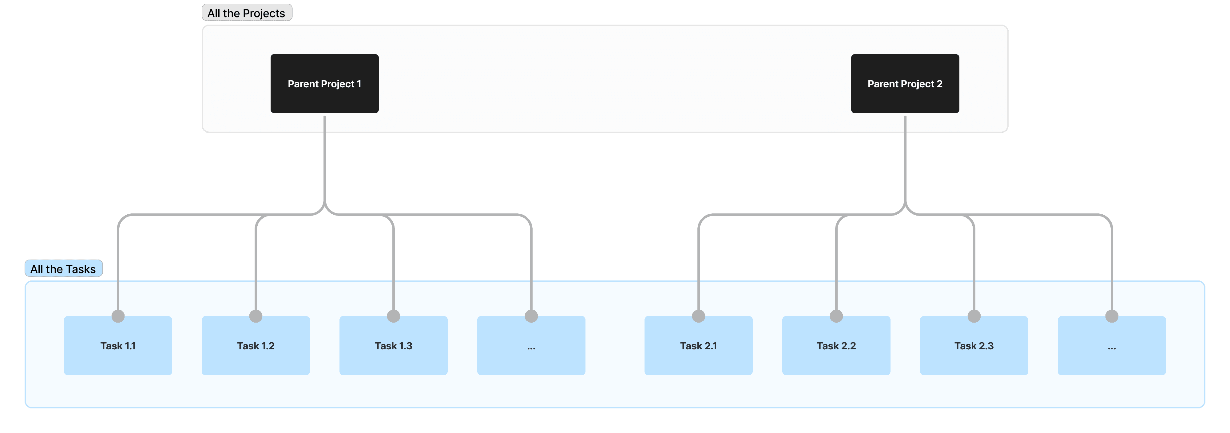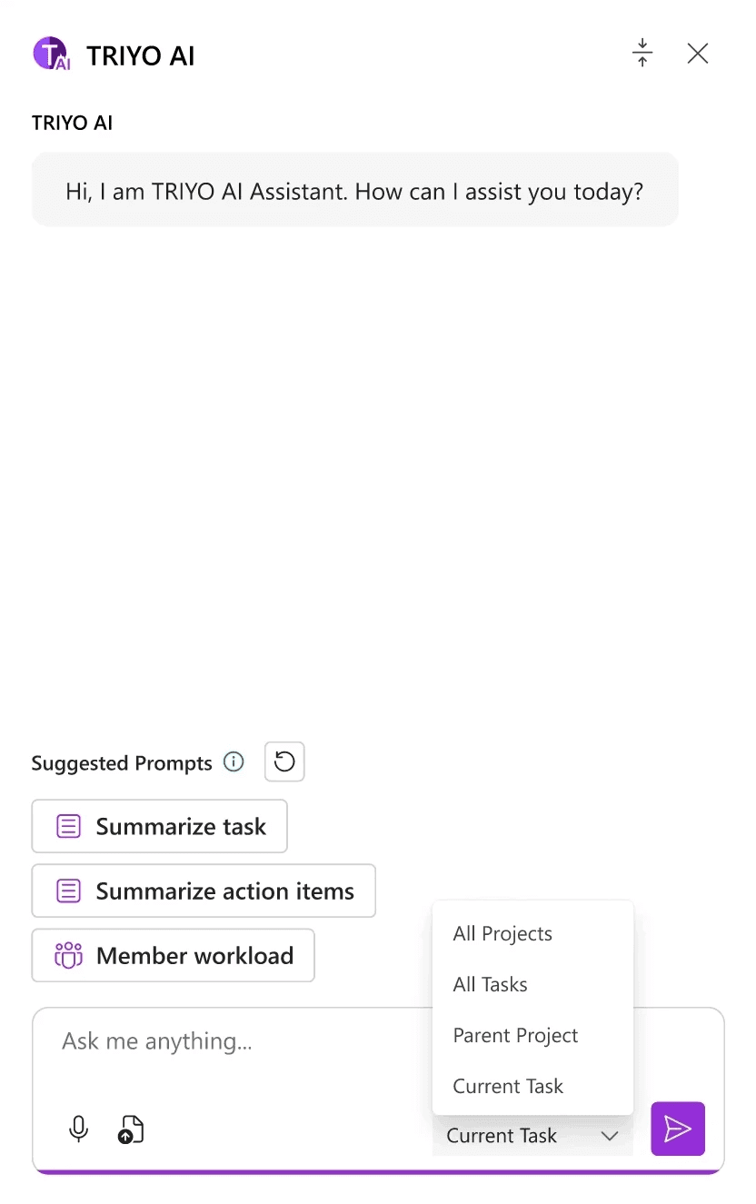 In the TRIYO data structure, context is crucial for defining the scope or range of data. For example, users can choose to summarize information related to the current task, the parent project of that task, or all tasks and projects across the platform. To enhance flexibility, a dropdown menu will be designed to allow users to specify the context when asking questions. This ensures that users can tailor their queries to meet their specific needs.