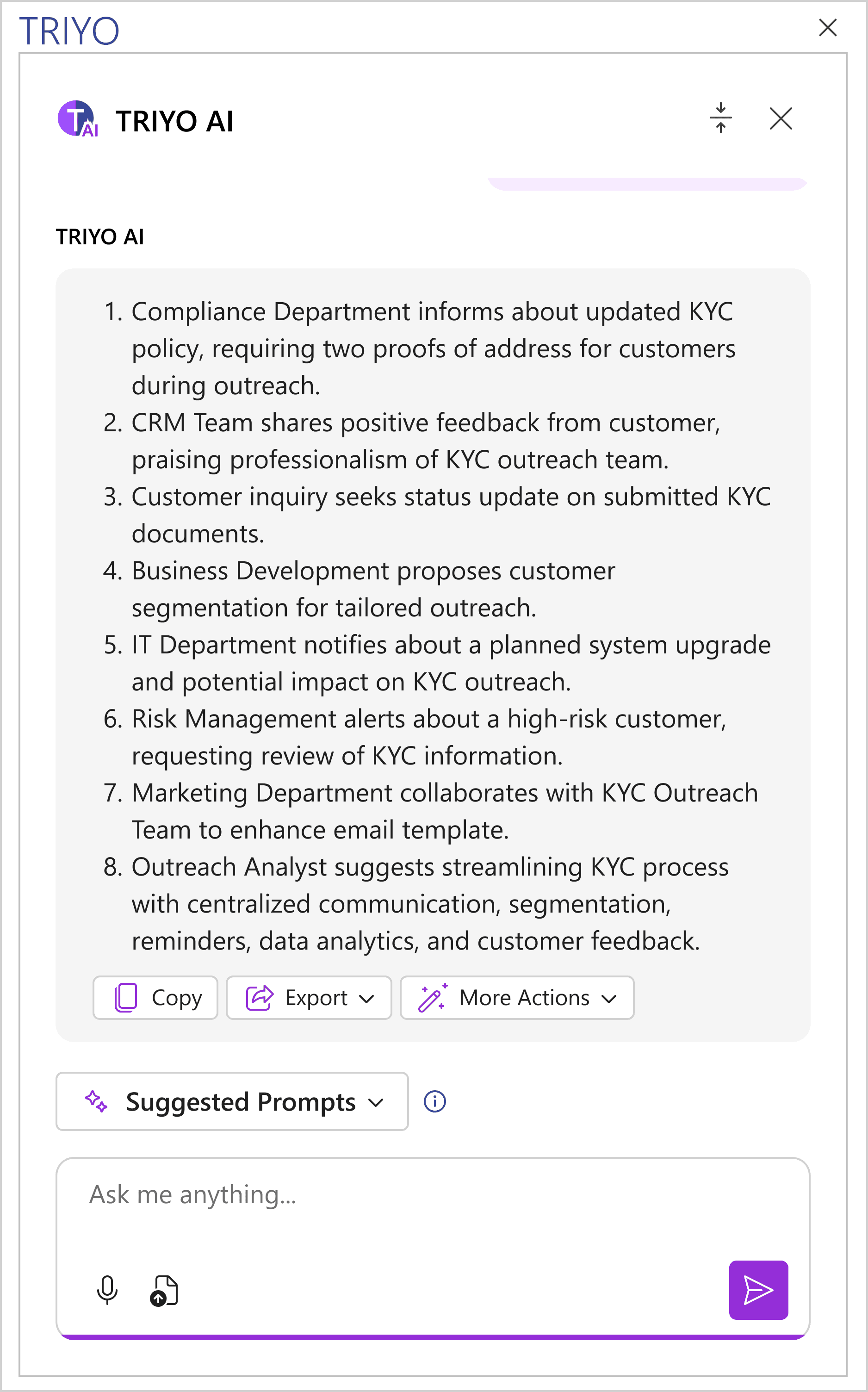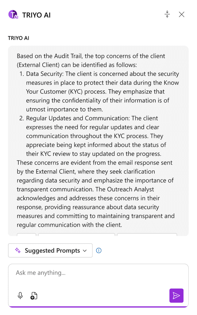 In this project, we took TRIYO Audit Trail a step further by integrating an AI-powered chatbot, leveraging Artificial Intelligence (AI) and Machine Learning (ML) to enhance the productivity in the KYC process. Our goal was to provide financial professionals with actionable insights and augment their workflows, helping them make more informed decisions while reducing the manual workload.