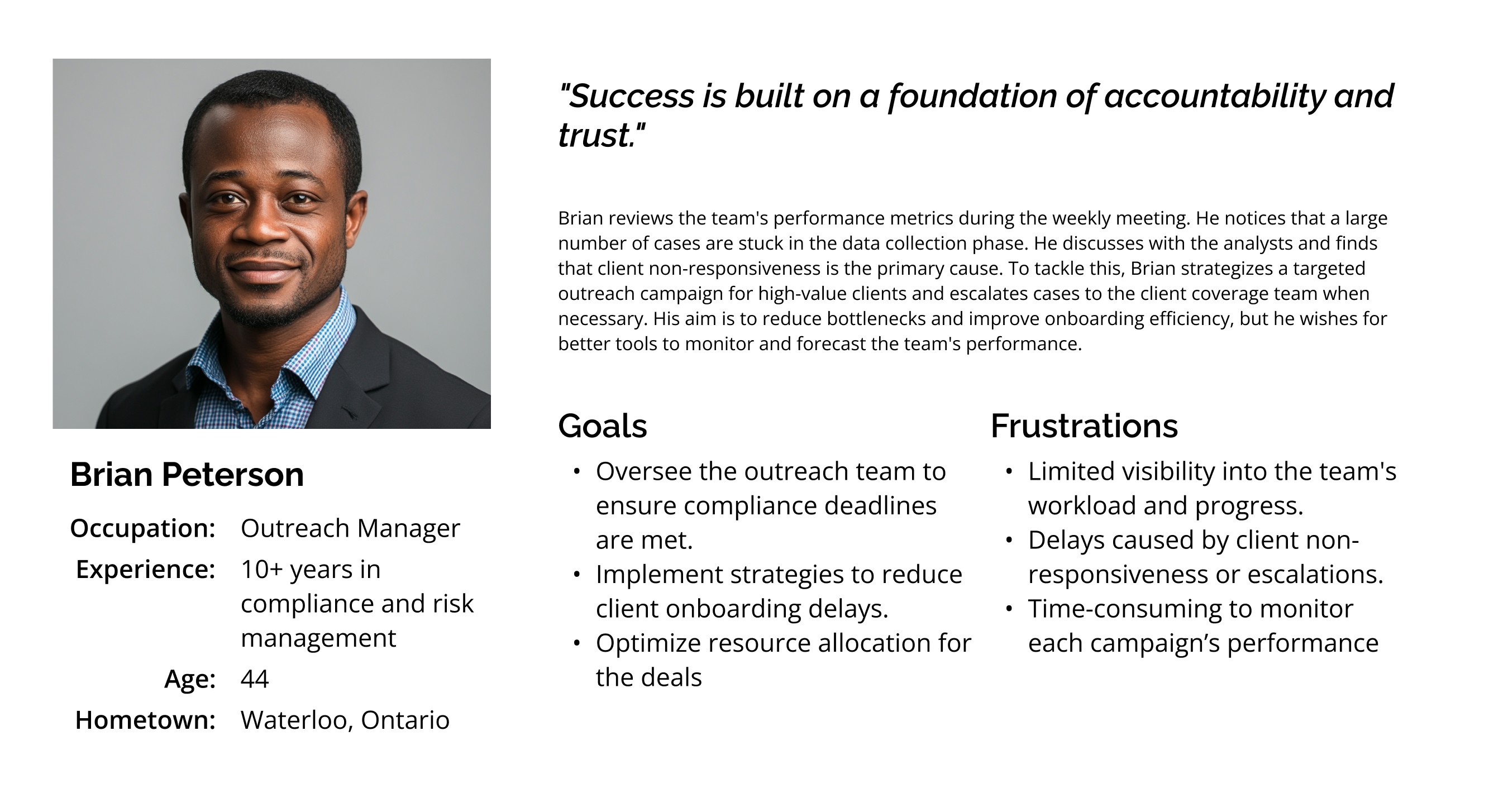 Brian is an experienced outreach manager who needs an efficient way to monitor his team’s performance and manage client onboarding, because he has limited visibility into his team's workload and progress, and client non-responsiveness often causes delays.