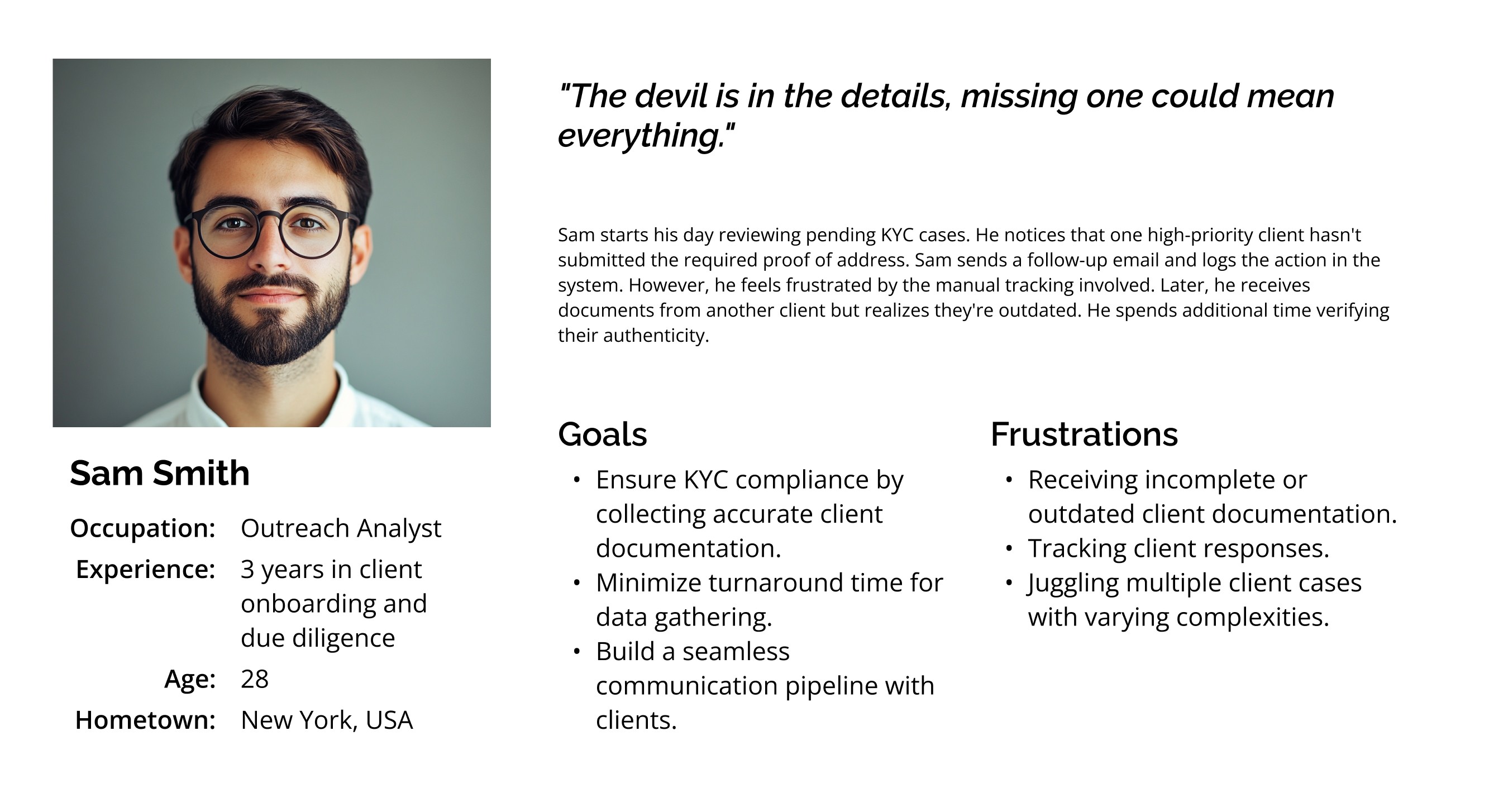 Sam is a detail-oriented Outreach Analyst who needs a efficient way to track client documentation and follow-ups to ensure KYC compliance efficiently. This is because he often receives incomplete or outdated documents and spends too much time manually tracking client responses, making it difficult to manage multiple complex cases simultaneously.
