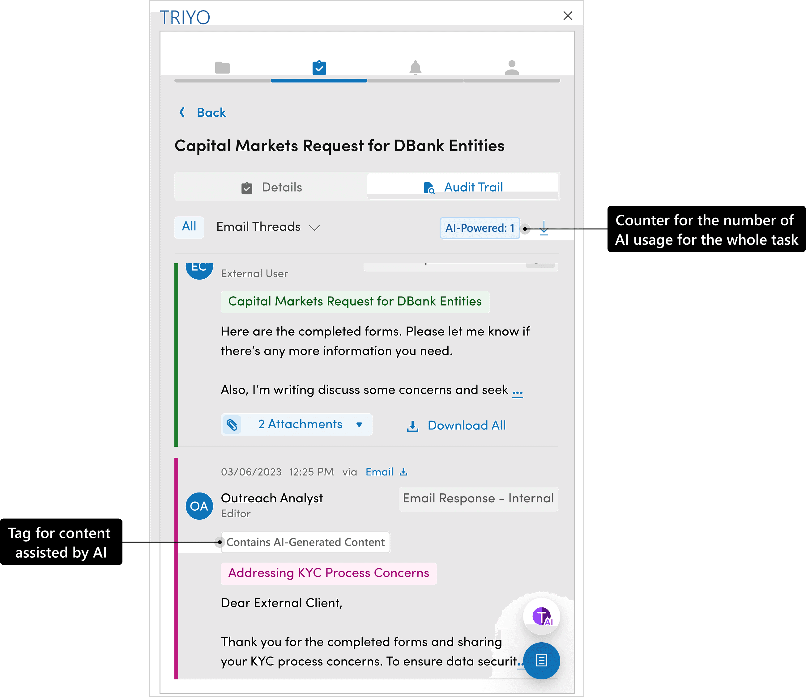 We integrated the AI Chatbot feature with the task tracking and reporting capabilities of the Audit Trail. Users can track AI usage directly within the Audit Trail Log, including details such as "How many times AI has been used for this task" and "Which content was generated by AI." In professional settings like financial services, this level of tracking ensures transparency, provides a clear log of interactions, and supports compliance requirements.