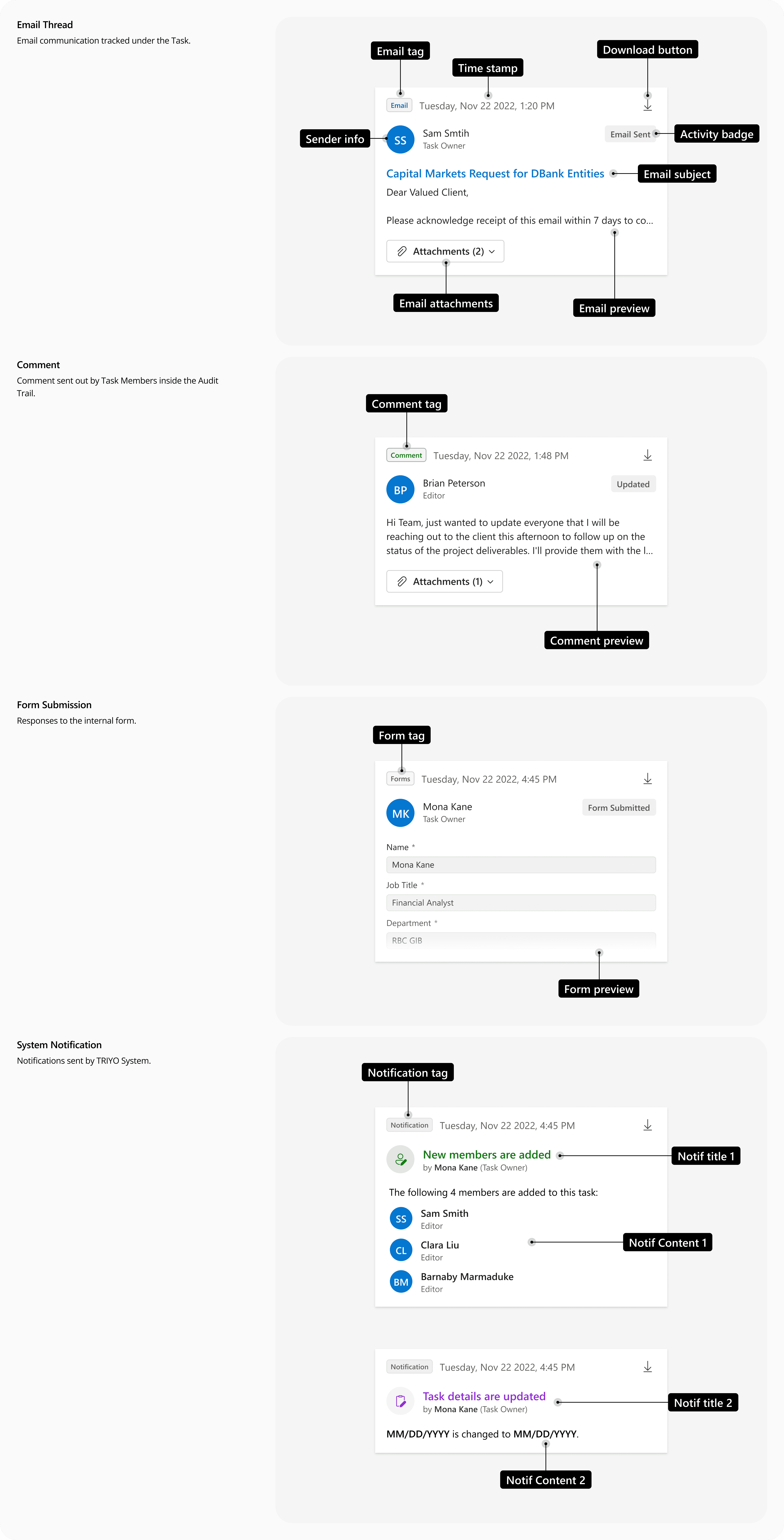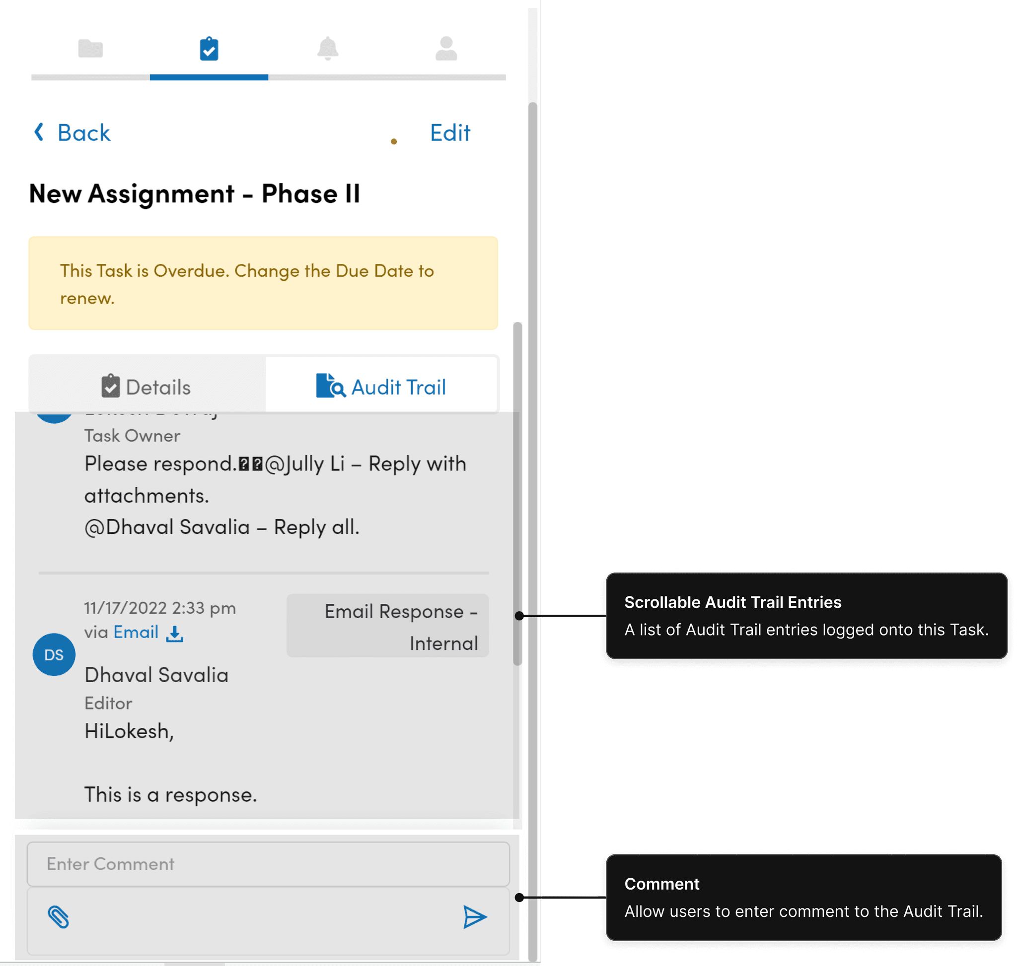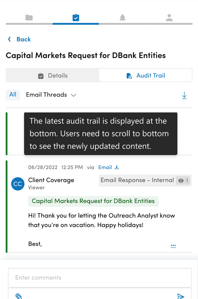 Financial Professionals should be able to quickly skim down the Audit Trail and understand what the task is about. At the same time, they might be also required to view the important entry (ex. email content) in more details.