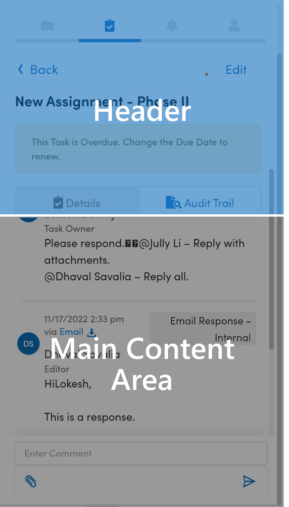 In the wireframing phase, we divided the Audit Trail Screen into two major UI regions: Header and Main Content Area.