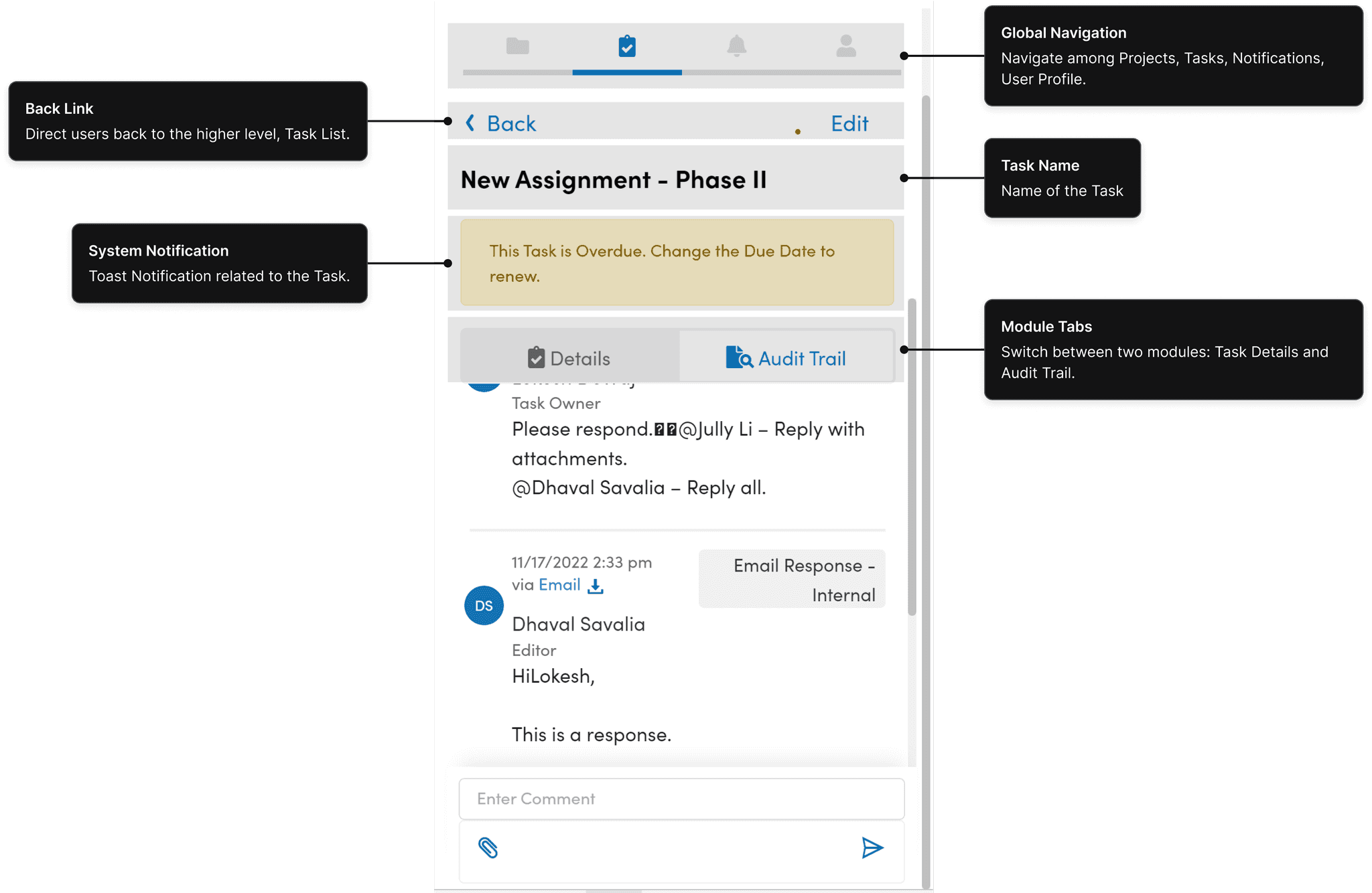Within each region, we further broke each region into elements. In the redesign, we wanted to keep all the essential elements (Global Navigation, Back Link, Task Name, Module Tabs) on Audit Trail and introduced a Tool Bar to the interface.