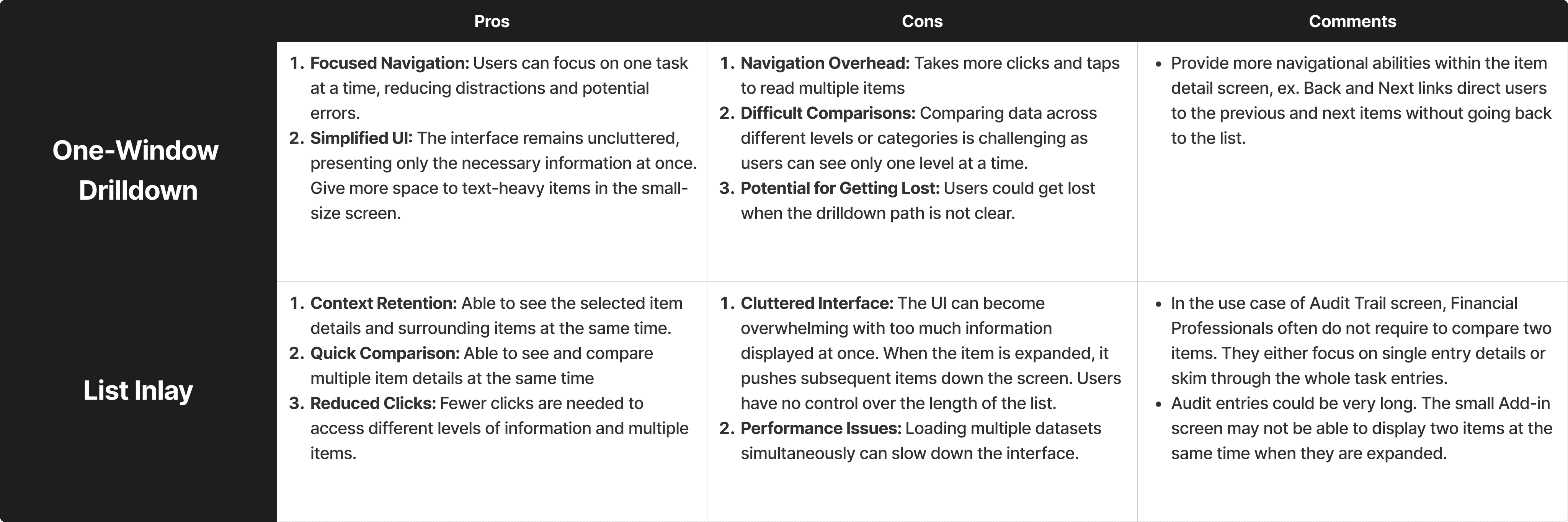 In the first design review session, we compared two methods' pros and cons, and decided One-Window Drilldown would be more suitable for Audit Trail use case.