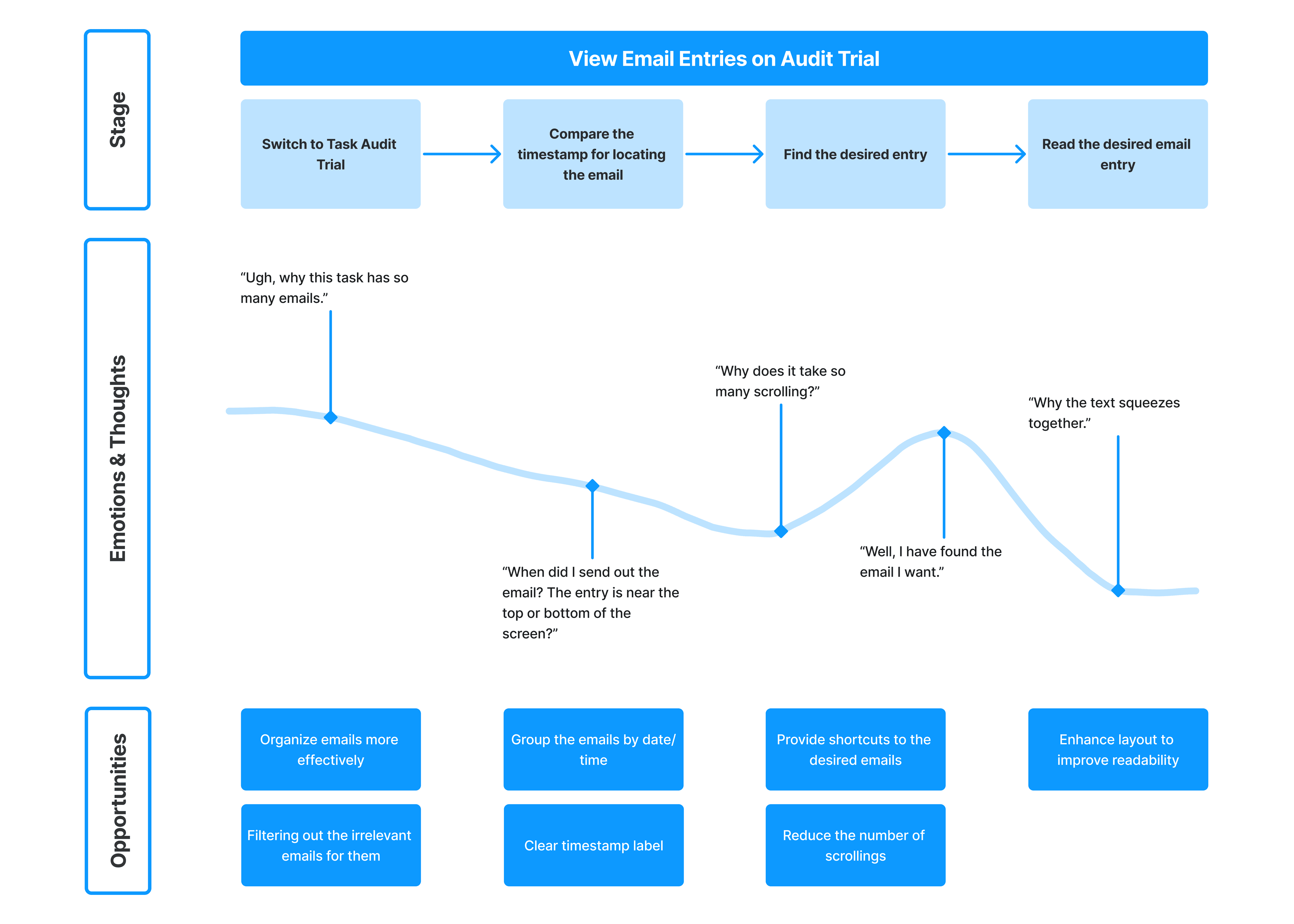 A user journey map of financial professionals locating the desired email in Audit Trail