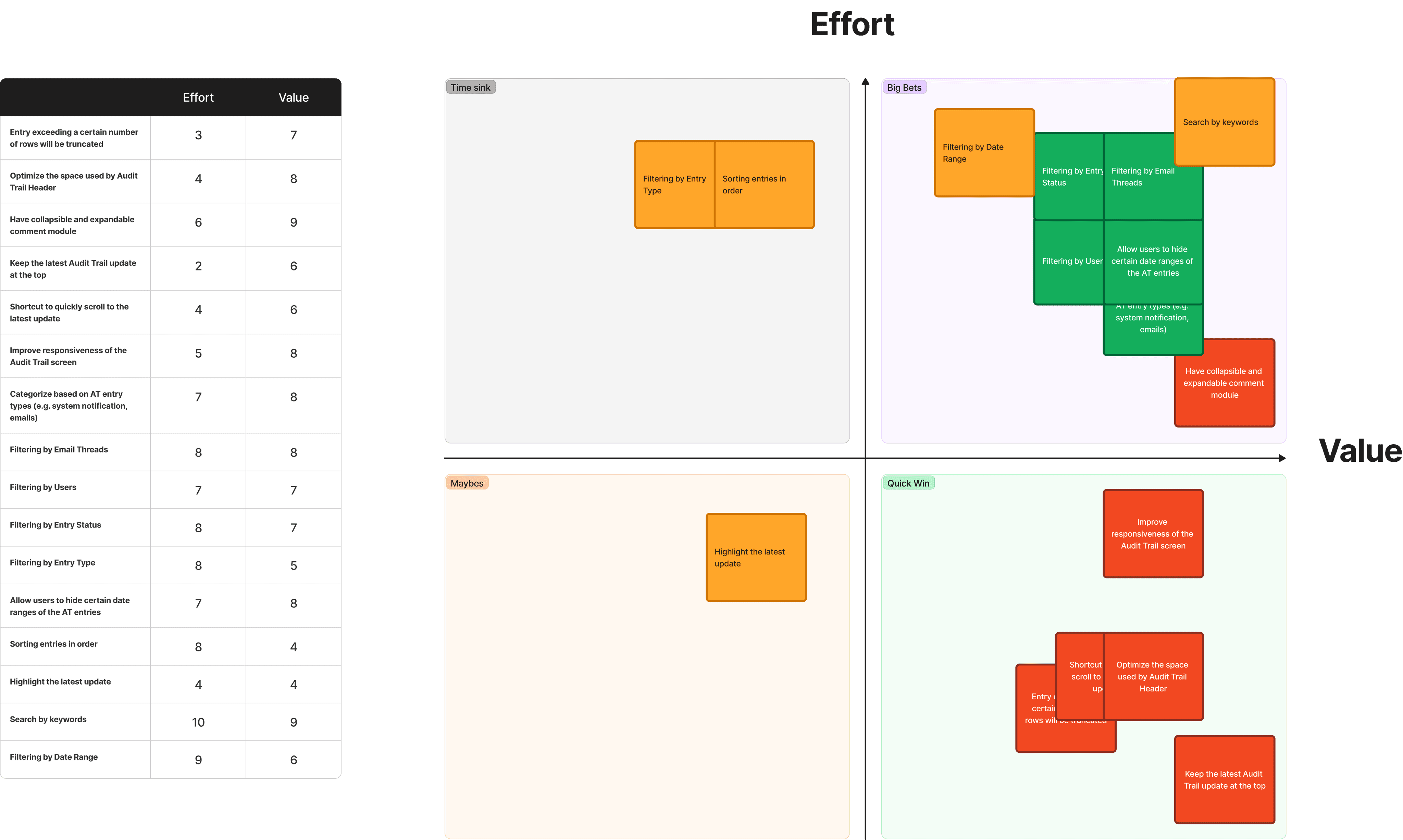 Next, we engaged with Developer Team and Product Team to score the 'Value' and 'Effort' for each feature in a 1-10 scope (Left), and plot the features using Effort vs. Value matrix (Right). Then, we visualize all the features in our bucket in 4 quadrants: