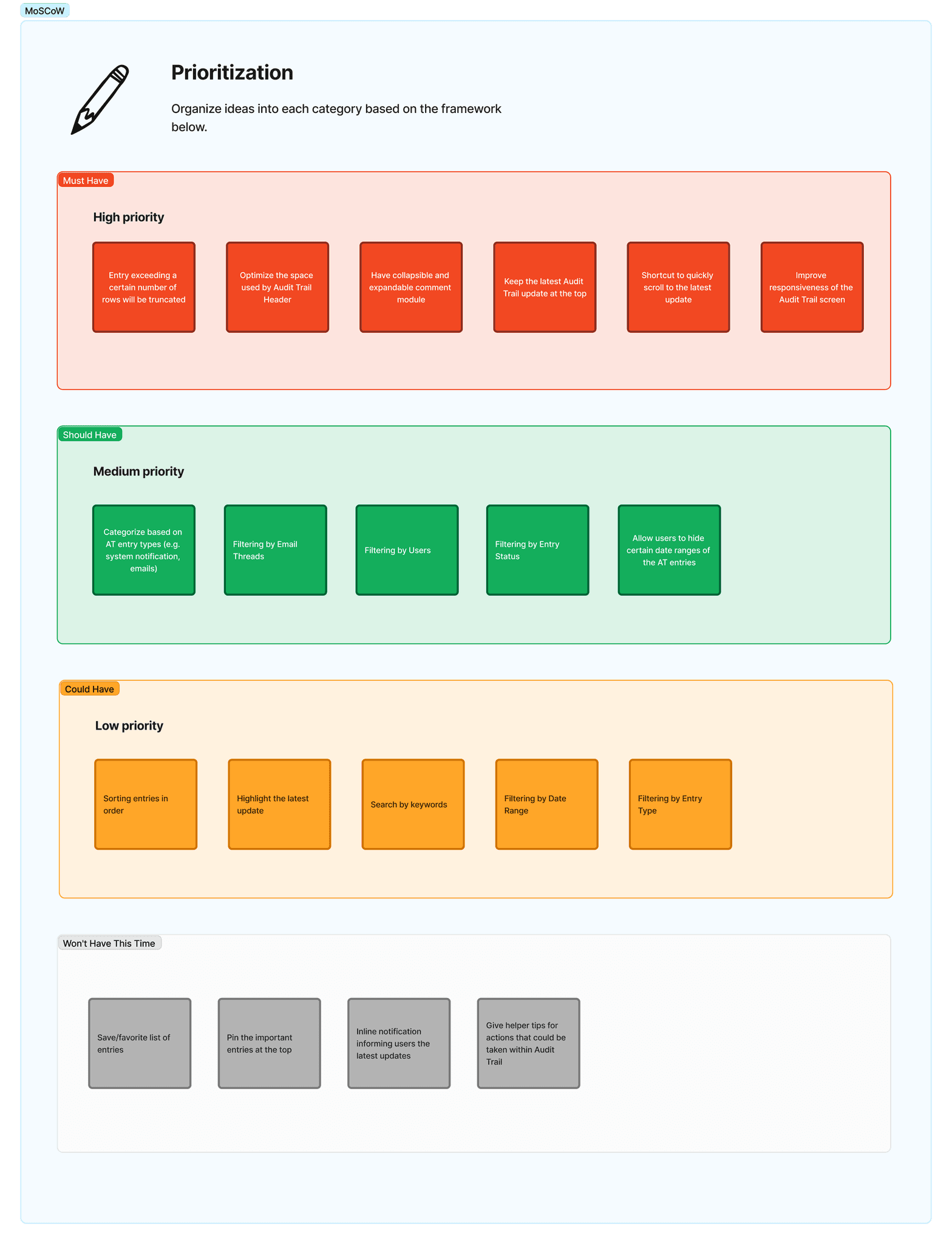 Firstly, we invited all the stakeholders to collaborate with us using MoSCow (Must Have, Should Have, Could Have, Won't Have this time) framework to group the features based on user requirements.