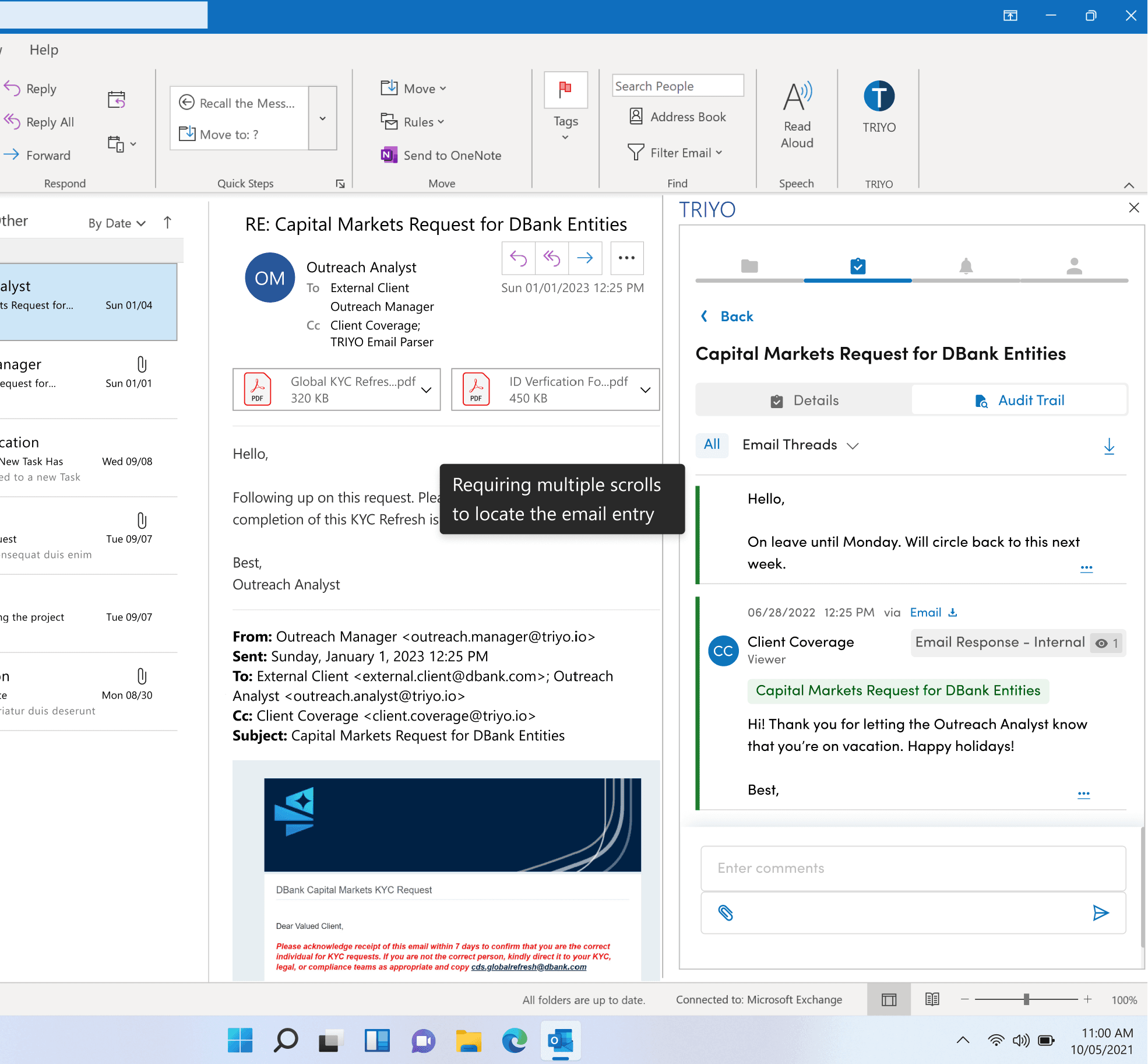Financial institutions like RBC (Royal Bank of Canada) Capital Markets often rely on email for client outreach in their KYC processes, They enhance their KYC procedures with TRIYO Outlook add-in for task collaboration and email tracking.