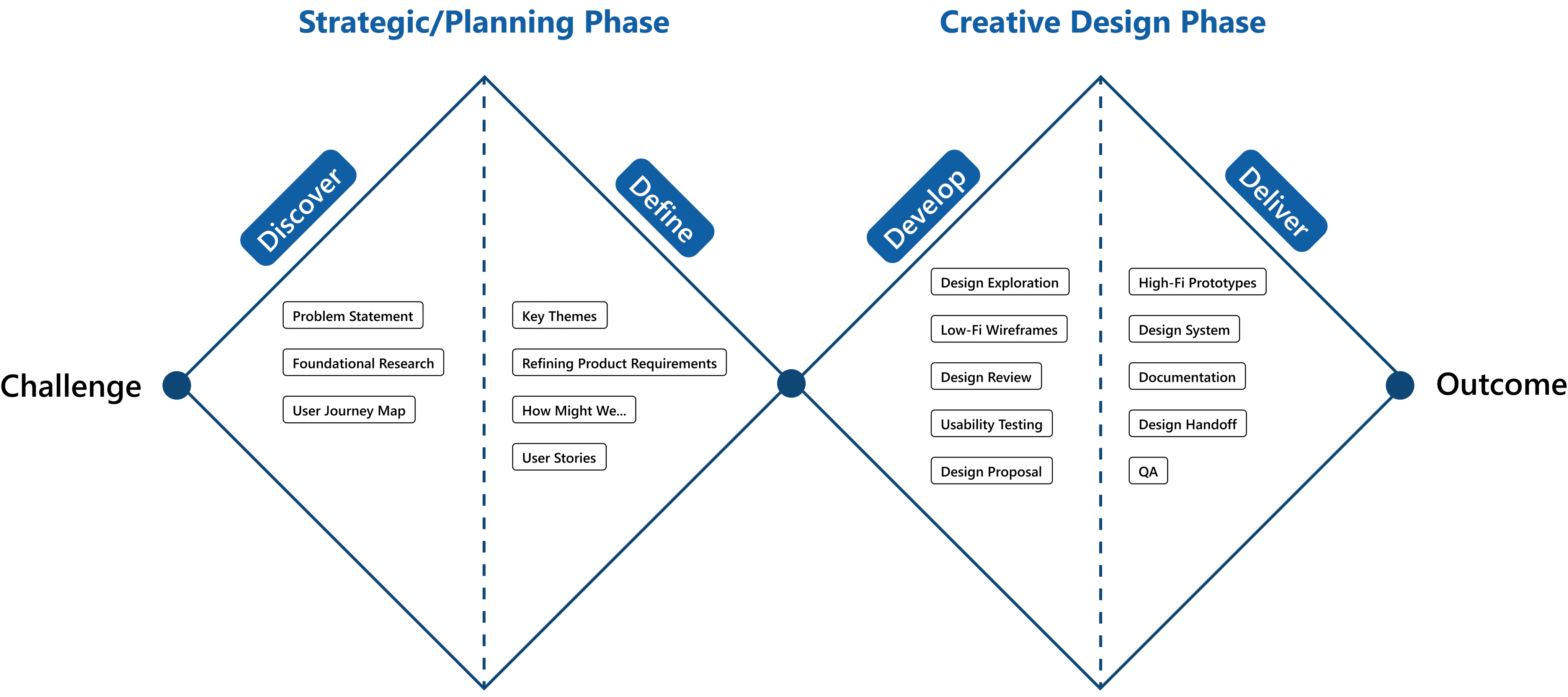 During the first stage (1st diamond: strategic/planning phase), we ought to identify the problem we needed to solve (Discover) and determine the area to focus on (Define).