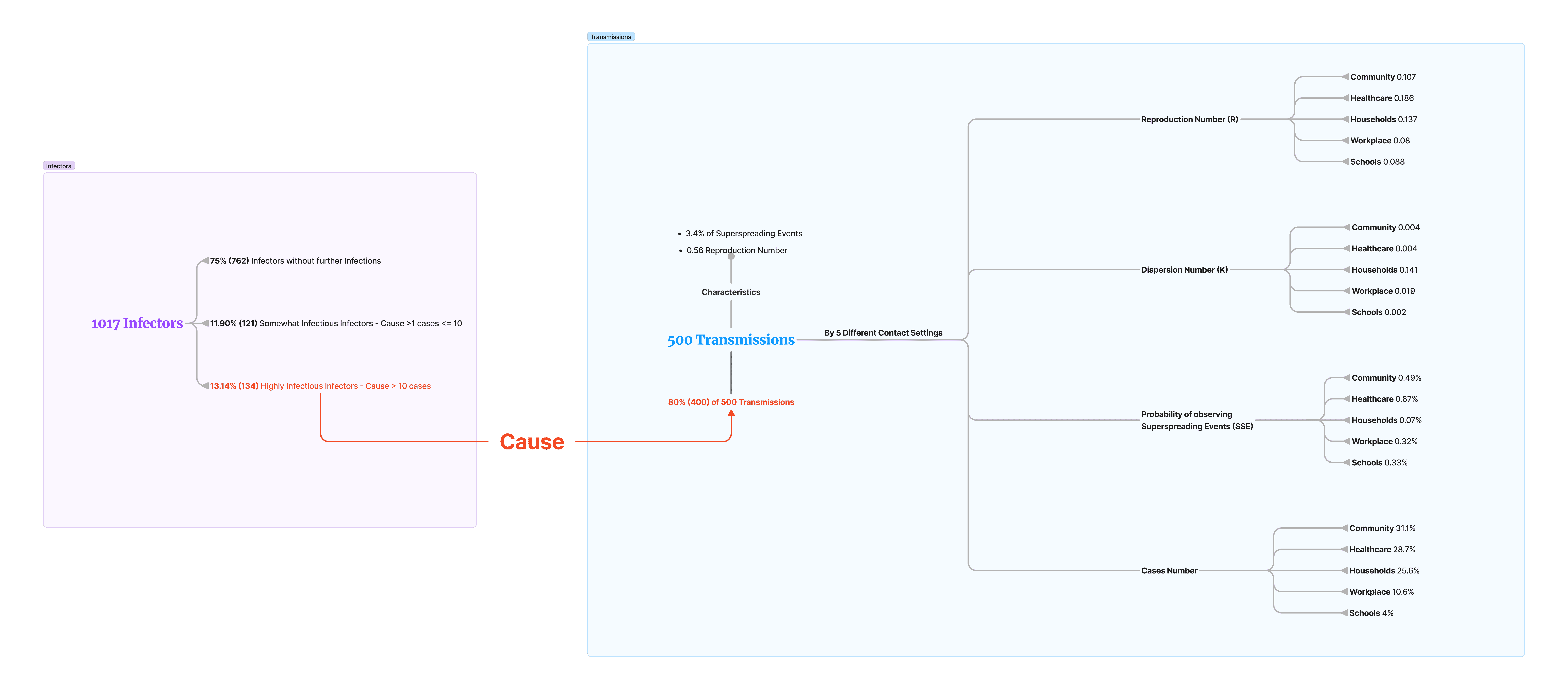 The top-left pie chart represents 1,017 infectors, while the top-right pie chart shows 500 resulting transmissions. Notably, 13.14% of infectors are responsible for 80% of the transmissions, highlighting the disproportionate role of certain individuals in spreading the virus.