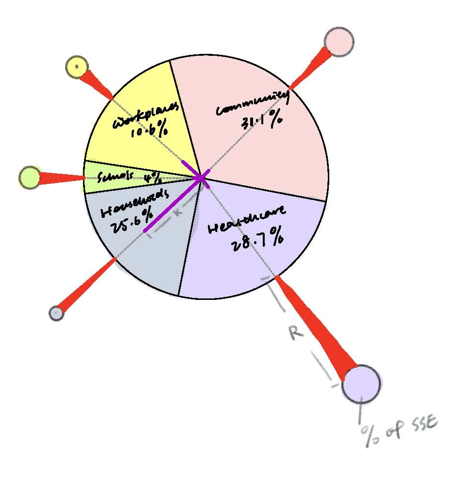 Each segment of the pie is connected to a "spike protein" extending outward, perpendicular to the arc of the segment. The length of each spike protein represents the R value for that setting, while the size of the spike protein’s head illustrates the percentage of superspreading events (SSEs) observed.