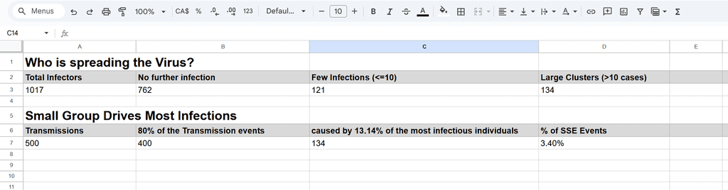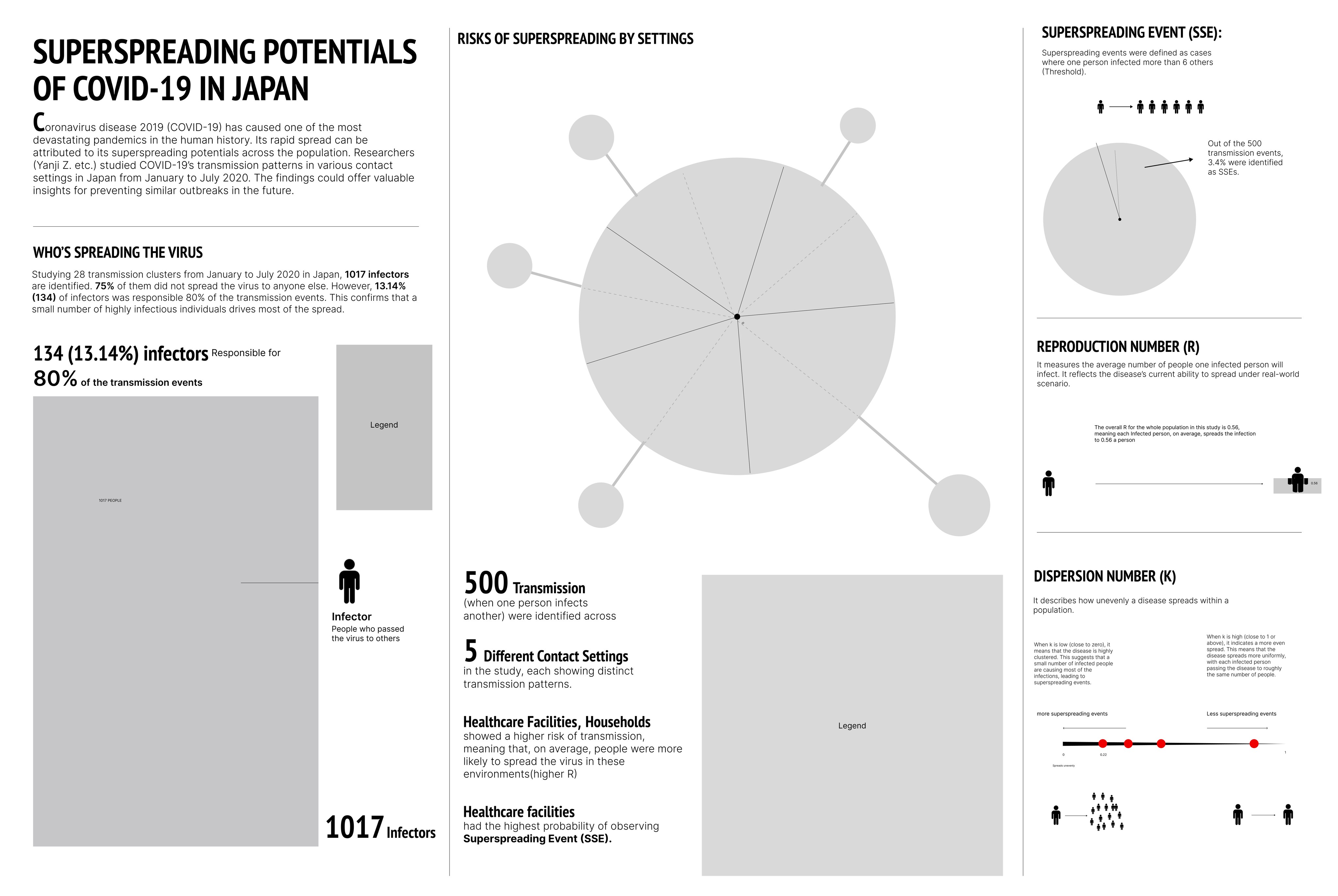 SSE (Superspreading Events): I used a person icon to illustrate that when one person infects more than six others, it qualifies as an SSE. Additionally, a pie chart shows that 3.4% of the 500 recorded transmissions were classified as SSEs.