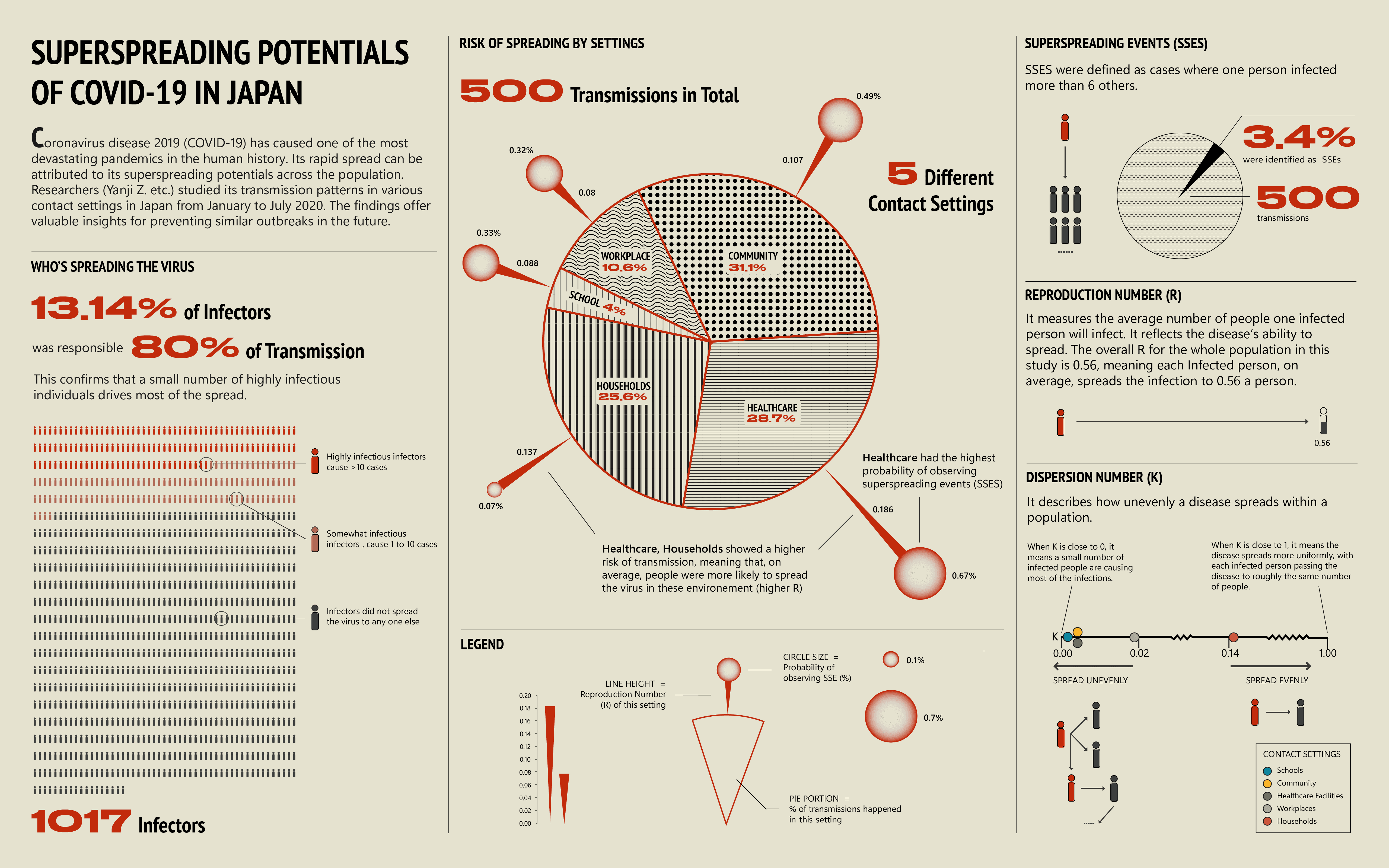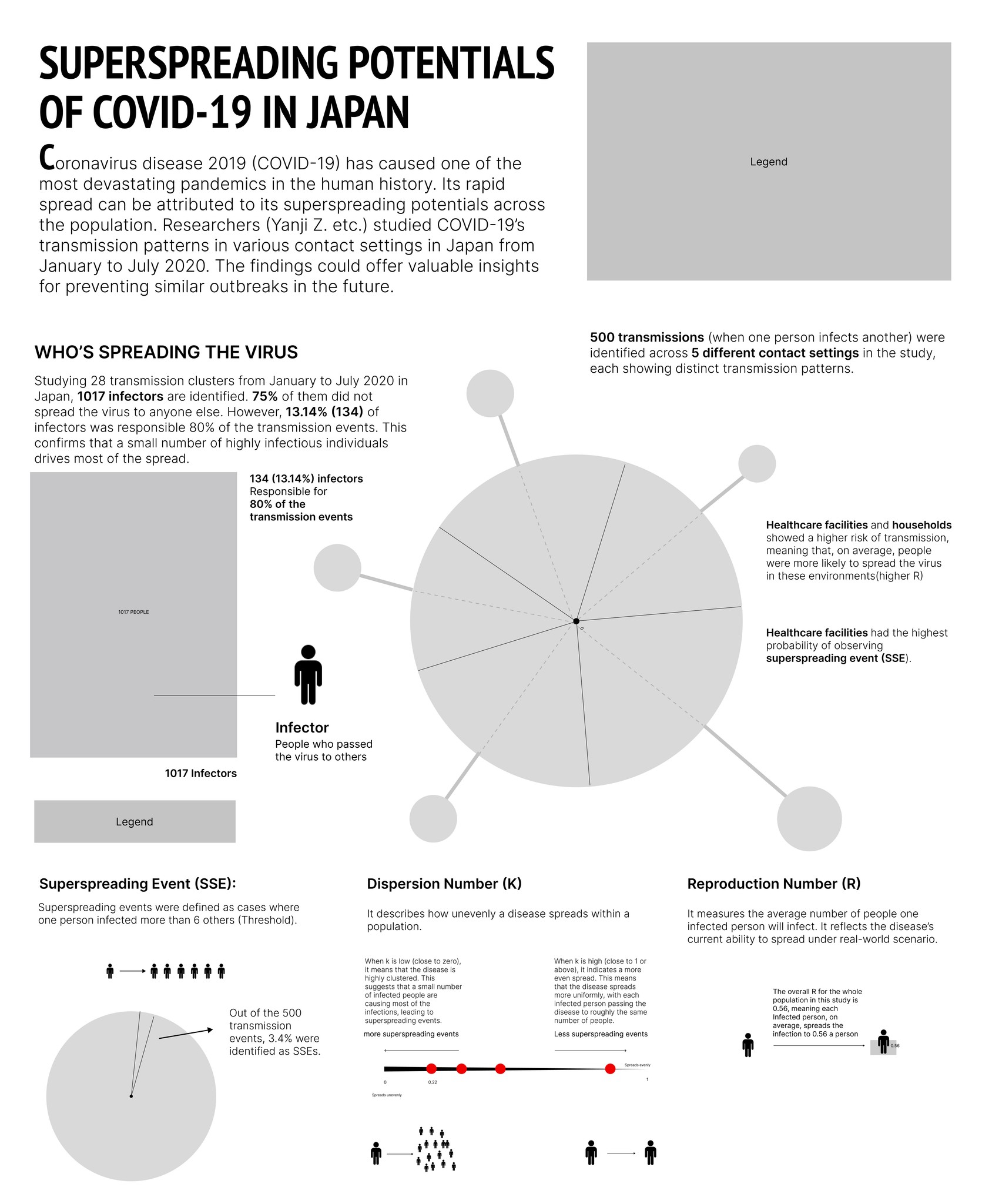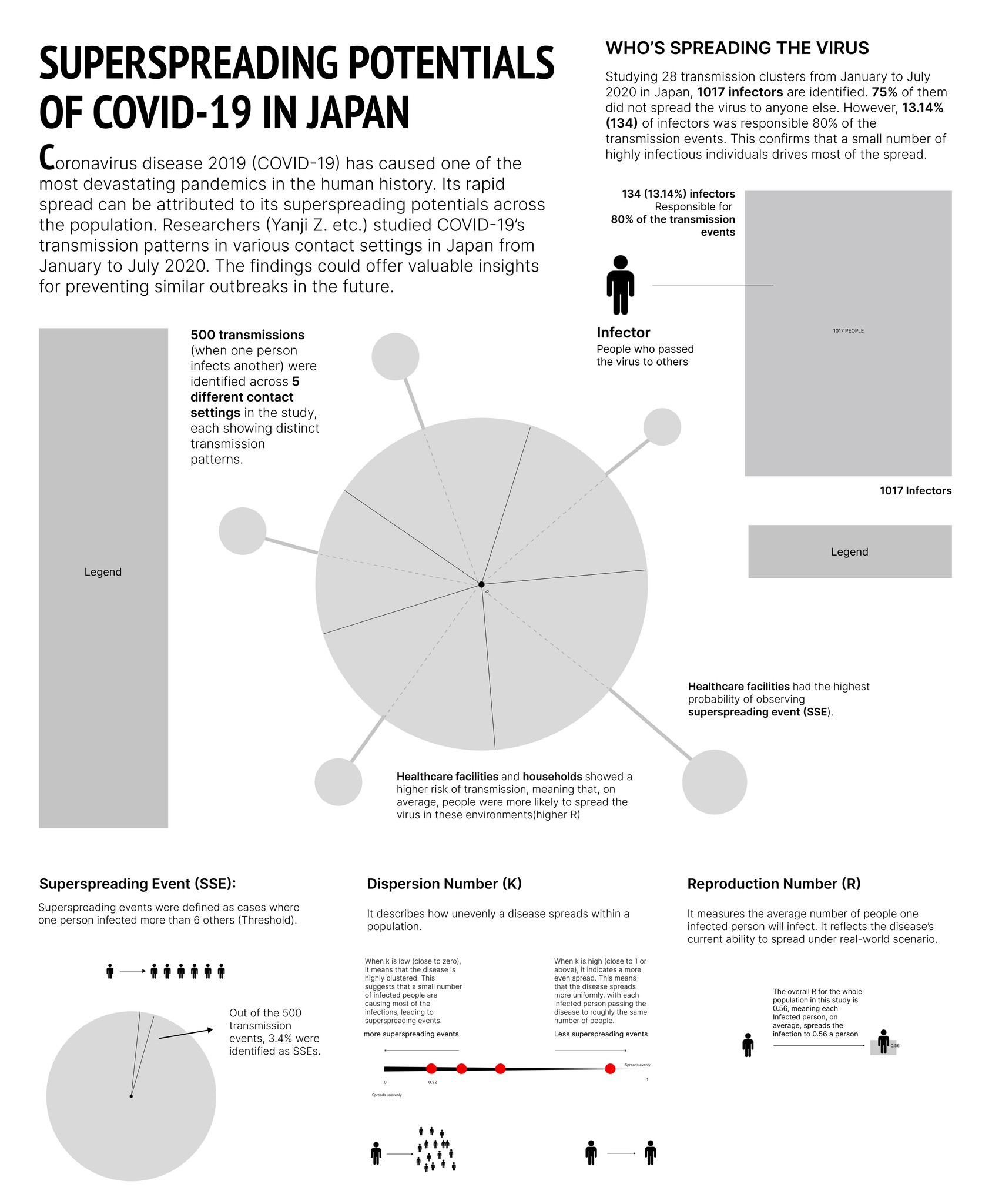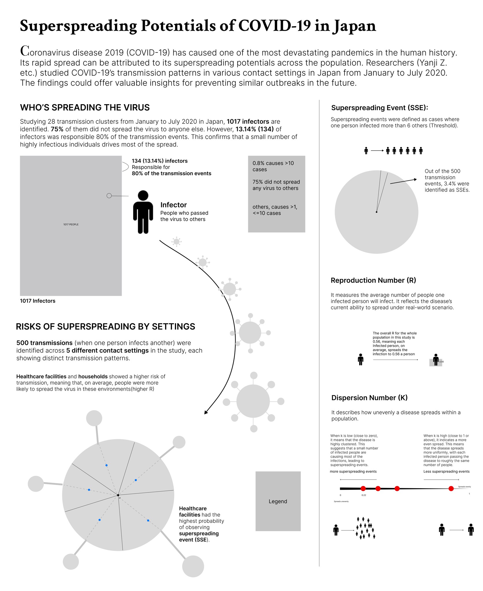 The final section on the far right outlines three key parameters—SSES, R, and K—that are critical in measuring superspreading potential in the research.