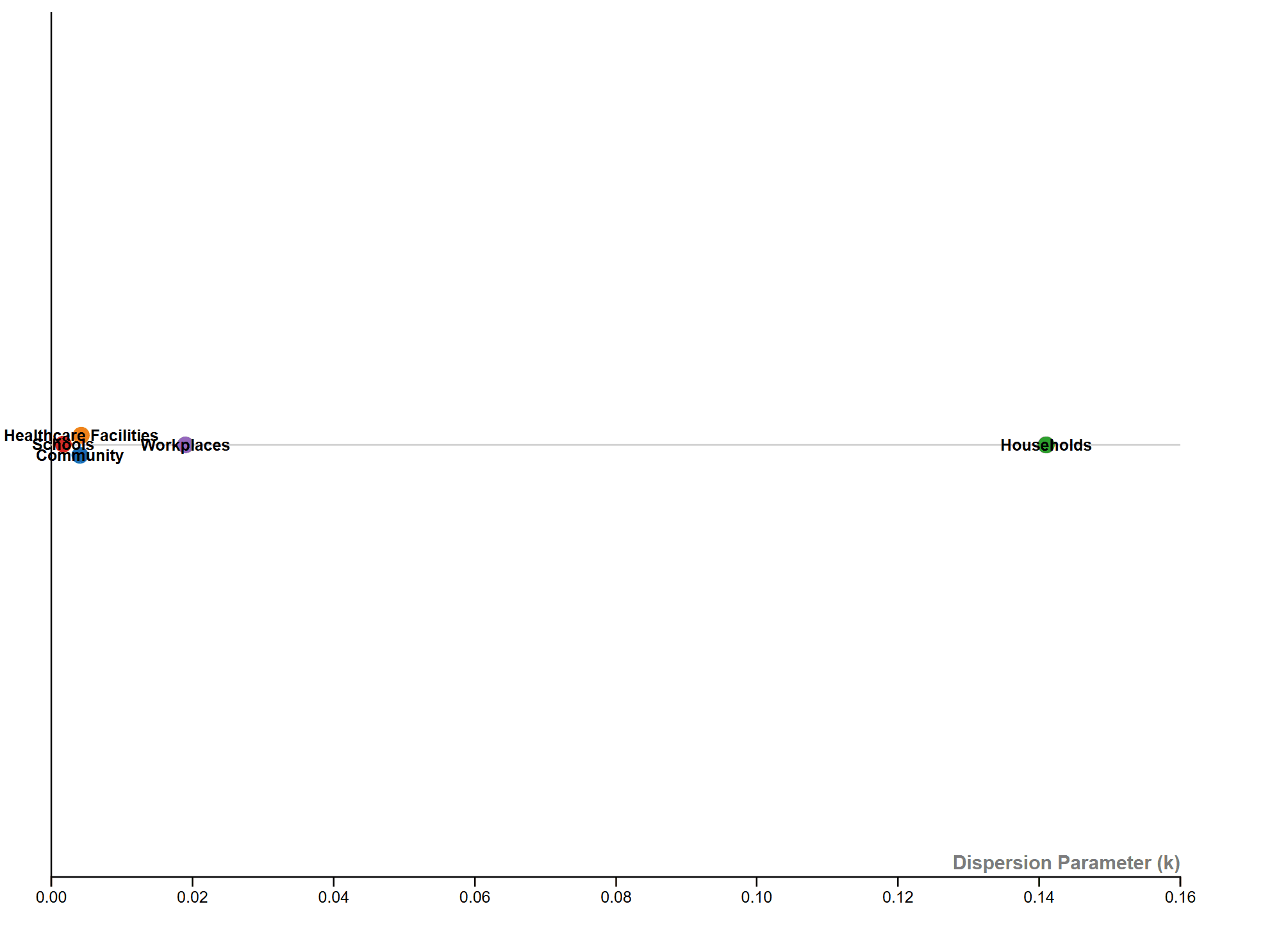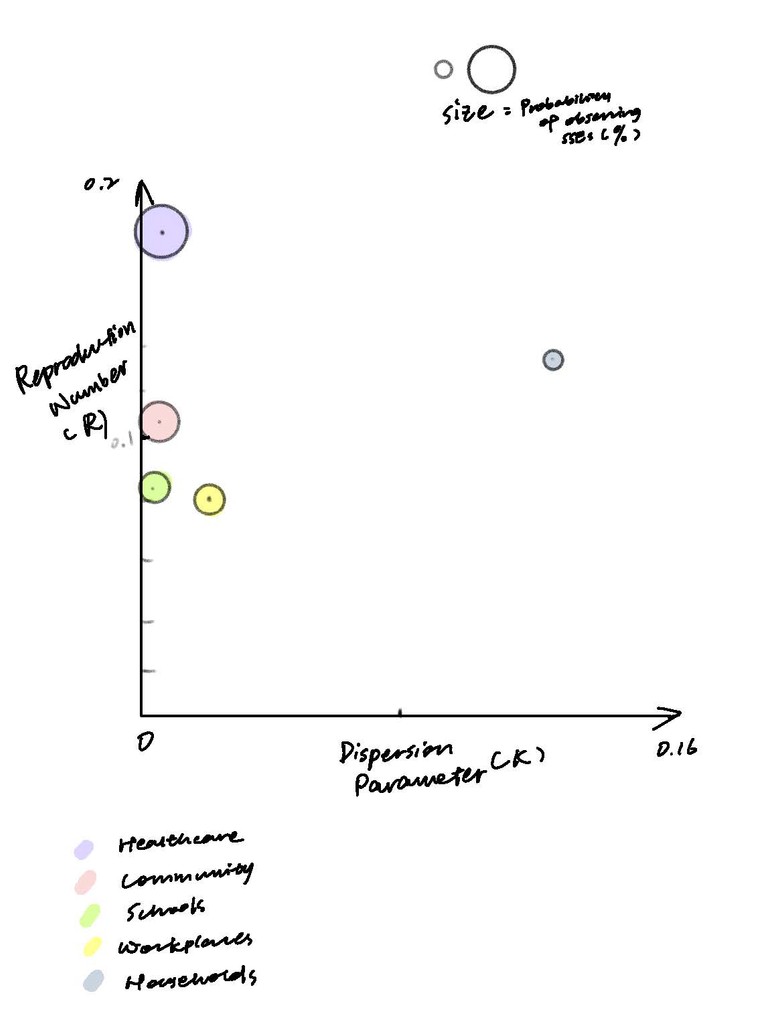 To visualize the data for all three parameters across five different contact settings, I created a bubble chart. The x-axis represents K, and the y-axis represents R. The bubble size indicates the likelihood of observing SSEs in each contact setting, with different colors distinguishing the settings.