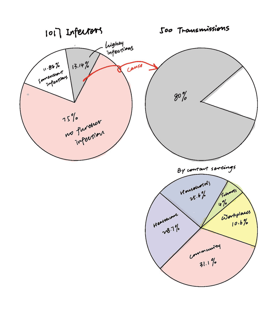The first section, "Who's Spreading the Virus," features a pictorial fraction chart in the final design, replacing the pie chart initially used during the sketching phase. Color is used to distinguish between the three groups of infectors, effectively emphasizing the disproportionate impact of a small number of individuals on transmission dynamics.