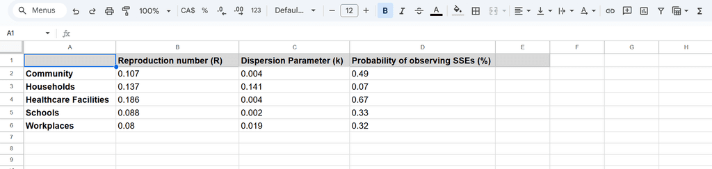 K (Dispersion Parameter): This value ranges from 0 to 1. A lower K (closer to 0) indicates that a small number of individuals are responsible for most transmissions, leading to superspreading events and uneven disease spread. In contrast, a higher K (close to 1) suggests a more uniform spread, with each infected person transmitting the virus to roughly the same number of people, making superspreading events less frequent.
